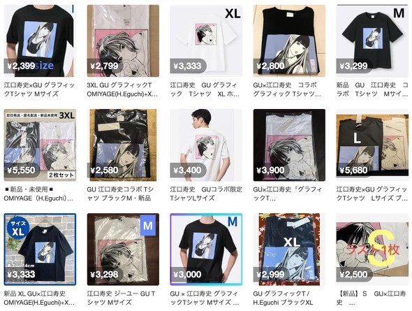 在網路上有不少網友表示,商品發售的第二天,便已經有大量消費者發出「已經賣光了!」、「為何GU的江口T恤會這麼快售罄?」等哀嘆,並發現T恤轉賣價格從定價1290日圓飆升至2500日圓至4000日圓不等,超過了原價兩倍以上。