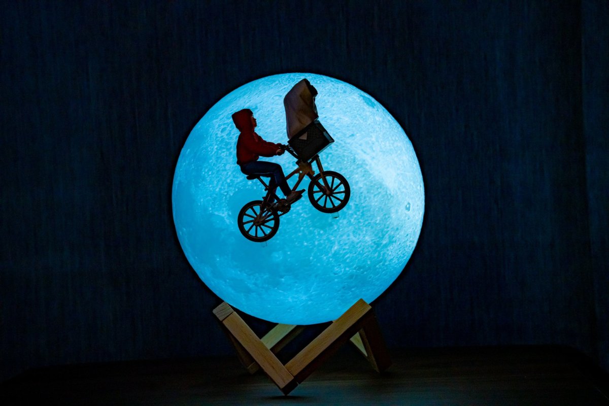 具體操作上,マイホビ將模型用雙面膠帶固定在月亮燈上,並將燈光設為水藍色。當燈光照射過來,逆光效果讓「E.T.」和埃利奧特的身影在燈光中若隱若現,彷彿重現電影中那個著名的飛行場景。這一創意不僅完美重現了電影的經典畫面,更為模型增添了新的視覺層次。