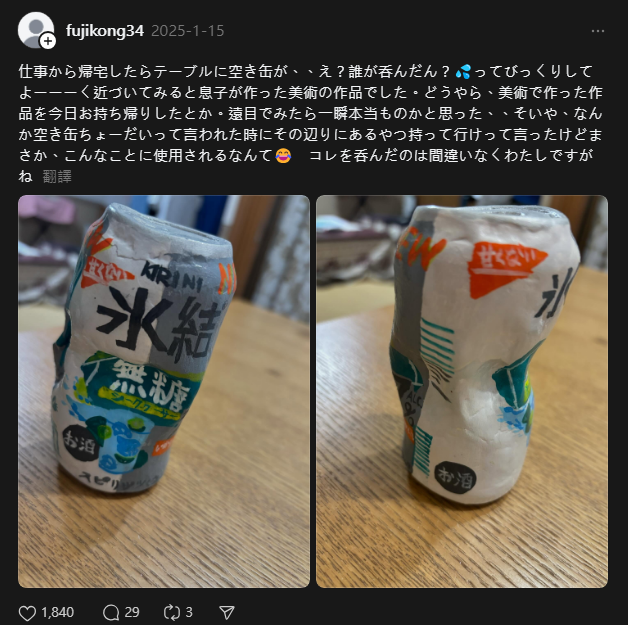 這段有趣的經歷由一位名為ふ。(@fujikong34)的媽媽分享。她表示,下班回家的時候,看到桌上的空罐頭,直覺以為是家人喝完之後,就隨便丟在桌上的垃圾。