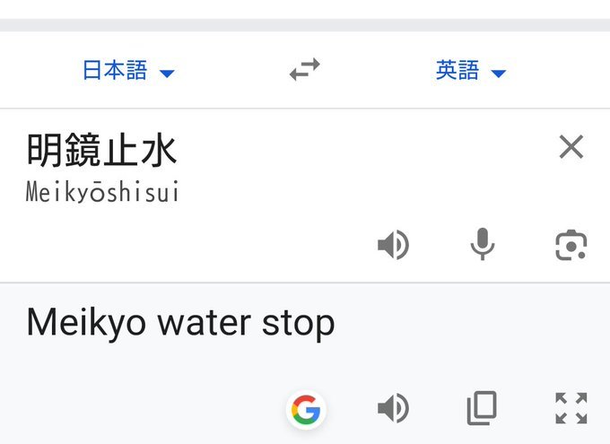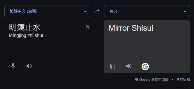 許多網友紛紛嘗試輸入其他成語,並分享各種令人捧腹的翻譯結果,讓話題持續延燒。而小編也實際以日文翻英文、繁體中文翻英文兩種方式,丟給Google翻譯。第一個日翻英的結果,跟推主一樣,是翻成了「Meikyo water stop」,而第二種中文翻英文,則是給出「Mirror Shisui」這個答案XD