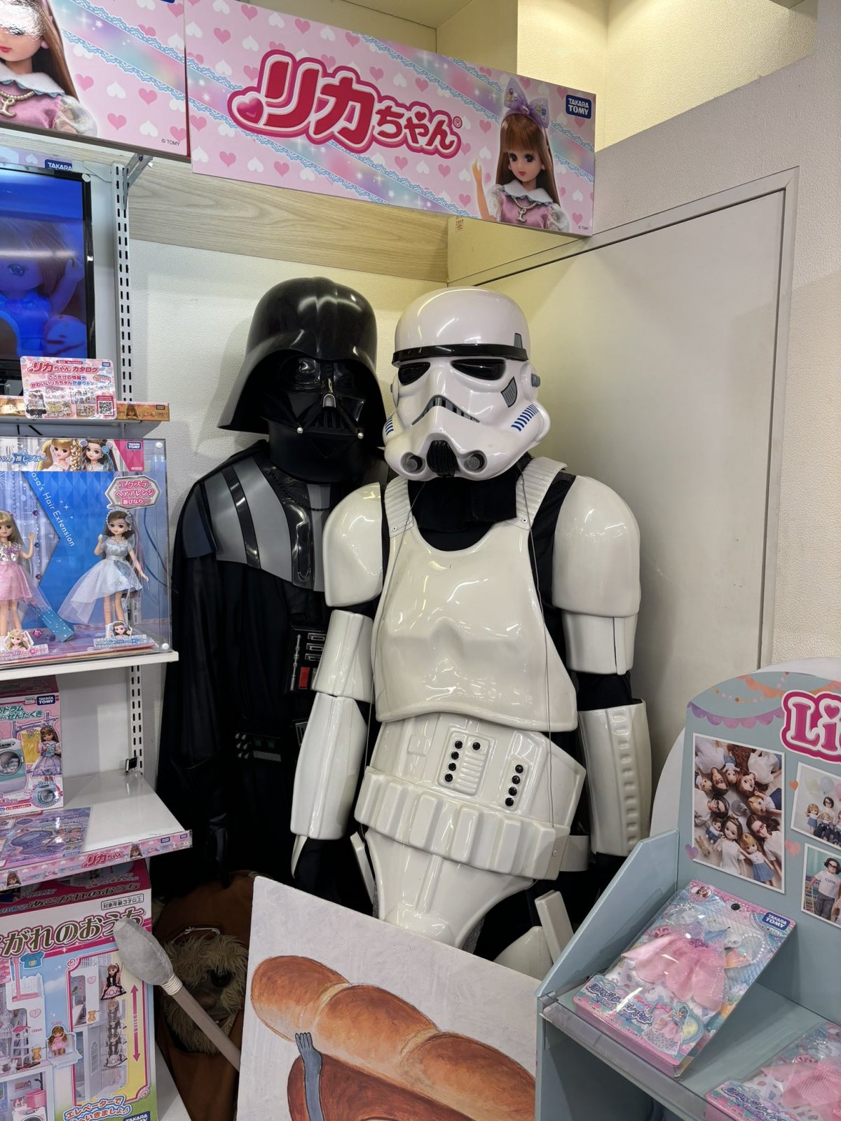 照片中,擺滿了莉卡娃娃的架子,所有的娃娃都擁有可愛的笑容和精緻的裝扮,但在畫面的角落,《星際大戰》的反派角色,達斯·維達和風暴兵,卻是靜靜地站在一旁,完全失去了他們的威嚴與氣勢,在這個充滿童話般的畫面中,顯得格外不合群。