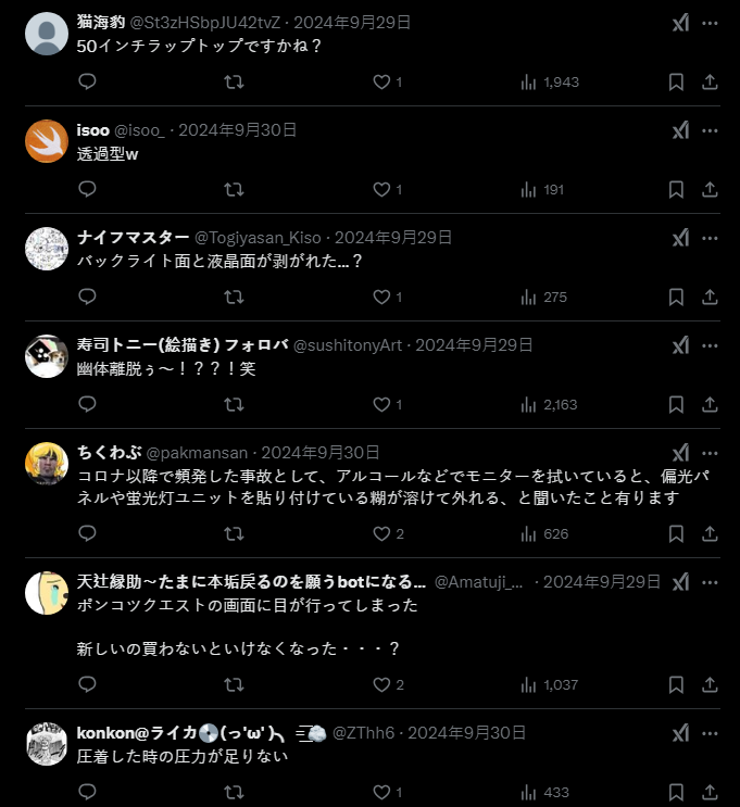 這一「壞掉方式」引發了大量的反應和猜測。許多網友表示驚訝「這樣也會壞?」「這是什麼情況啊?」甚至有網友誤以為照片中的設備是筆記型電腦,直到讀到其他留言才恍然大悟。有些網友更表示,這樣的顯示器或許可以用膠帶將其黏回來繼續使用,展現出一絲樂觀的態度。