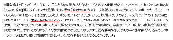 麥當勞的快樂兒童餐自1987年推出以來,以美味的餐點,與附贈的玩具,一直以來深受小朋友們喜愛。過去,快樂兒童餐中的玩具常常被區分為「男孩向」或「女孩向」,例如迷你車會標註為「男孩向」,而娃娃則是「女孩向」。但事實上,這種性別區分的方式如今已經不再使用,改為以「酷炫系」和「可愛系」來分類玩具。