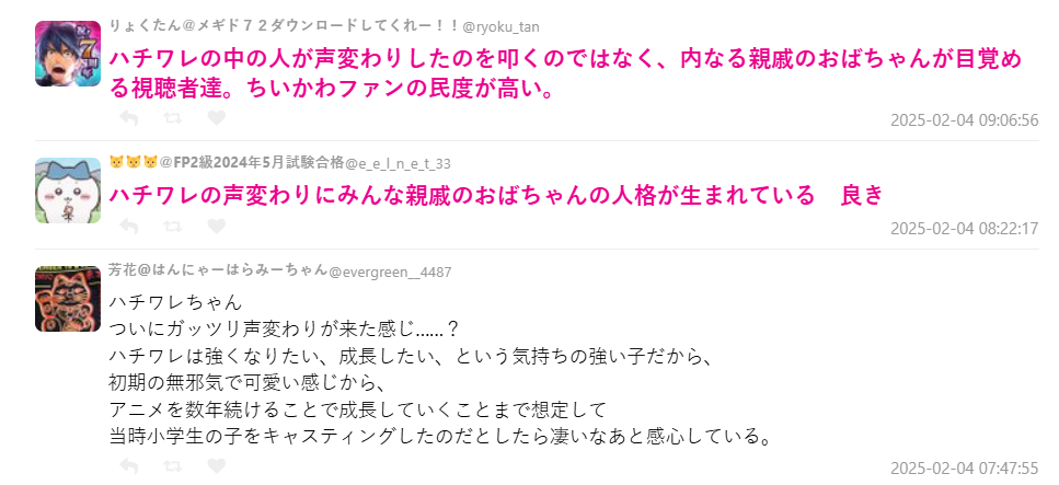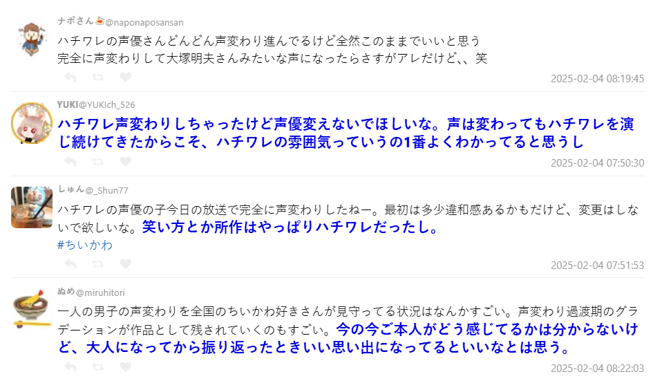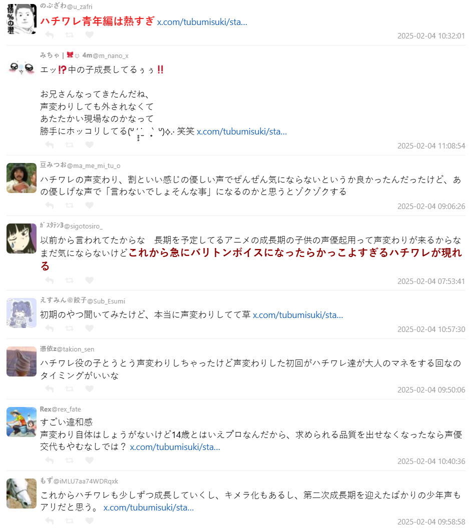 因此,X上「變聲」一詞登上趨勢熱搜,網友們紛紛表示:「能感受到田中誠人小朋友的成長,覺得好溫馨」、「角色和聲優一起成長,感覺很感慨」、「又往大人的階梯邁進了一步呢」等,掀起熱烈討論。