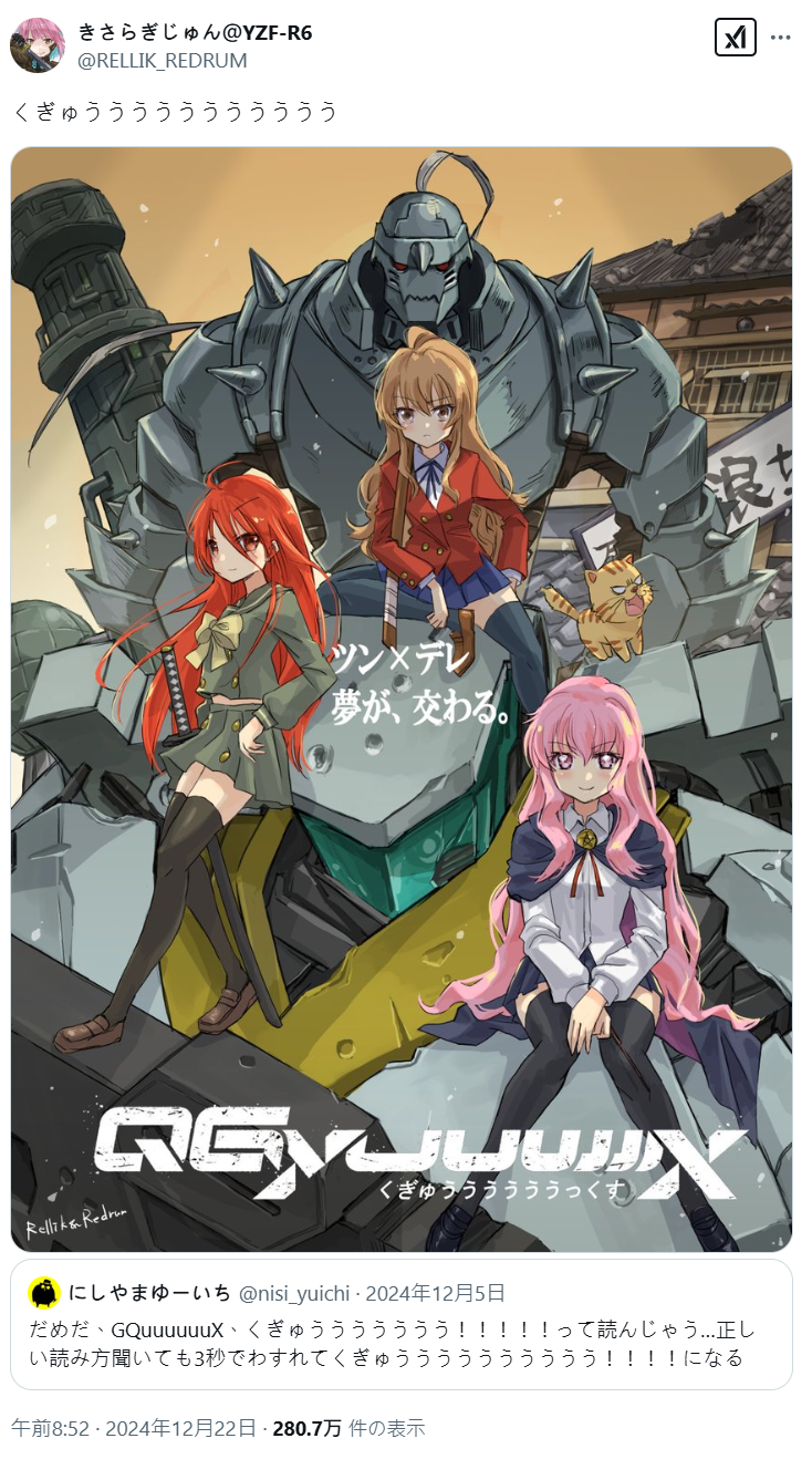 當然這也不是山下育人的獨有想法,先前 12 月就有網友表示,「GQuuuuuuX」實在不知道怎麼唸,反倒唸成「QGuuuuuu」,就變成「くぎゅうううううううううううううううう」了...,還因此畫了仿照劇場版的視覺圖,放上釘宮招牌的三位女角 - 夏娜、露易絲與逢坂大河。