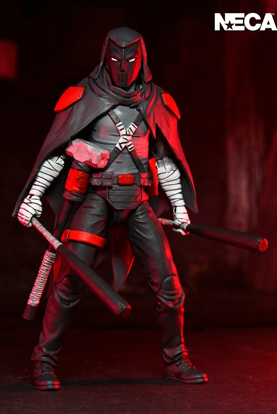 本次的夜巡者凱西·瓊斯同樣採用了漫畫第三期的開頭,艾波回憶中在拉斐爾殞落後自己險些被紫龍幫(The Purple Dragons)傷害時,幾人現身出面營救的模樣。手腳部分沿用了先前「最後的浪人 凱西·瓊斯」的零件,本體以新規製作,為他打造了相對輕便的 X 字背帶,塗裝沿襲了此系列以黑色描線刻畫出漫畫風格的特色,並以標誌性的紅黑色調上色還原漫畫中的新造型。配件部分則新增了獨特的斗篷及兜帽,面具造型與最終殞落時的版本有些許不同,露臉的頭雕改為直接與面具相連接,武器雖部分沿用,但減少收錄了曲棍球棍與球棍袋。這個戴上兜帽的樣子真的超帥啊!
