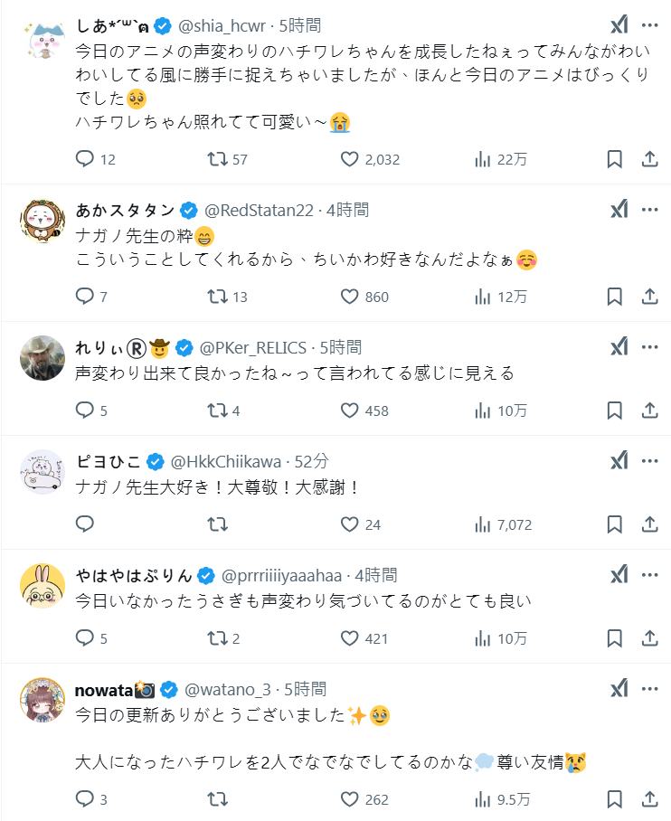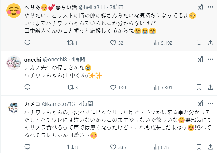 看到作者ナガノ的圖,不少網友也留言表示,對於小八聲優田中誠人因為成長「變聲」加油打氣,這也是粉絲跟聲優一起成長的展現,希望不要因為這樣灰心喪氣,畢竟只是個 14 歲的孩子,大家會繼續支持他,別在意部分質疑好好做自己就好。