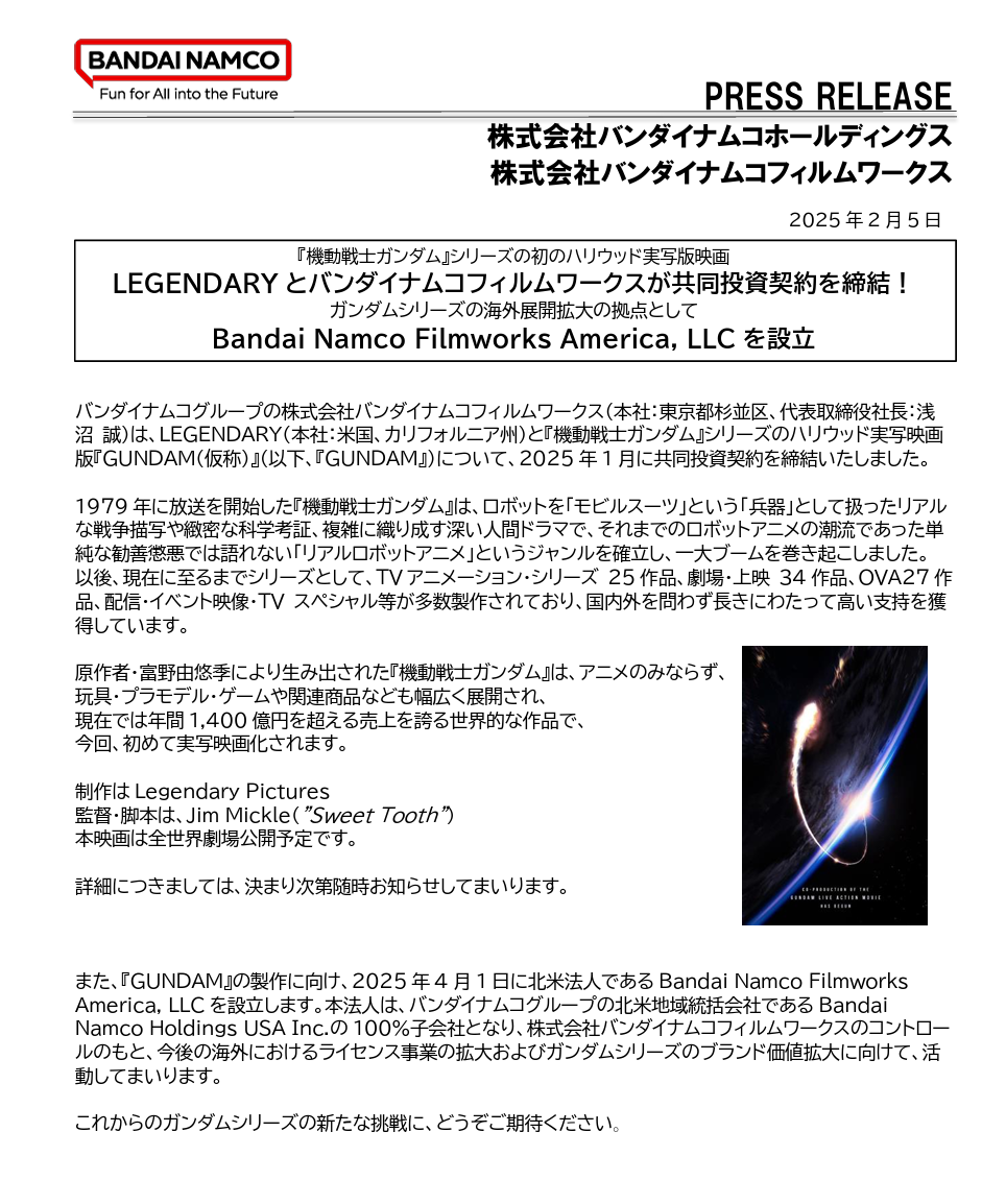 該消息也公布在 SUNRISE 官網上,萬代南夢宮也宣布,為擴大鋼彈品牌在北美市場的影響力,將於 2025 年 4 月 1 日 成立全新的北美子公司 「Bandai Namco Filmworks America, LLC(BNFA)」。該公司將隸屬於萬代南夢宮集團的北美統括公司 「Bandai Namco Holdings USA Inc.」,專注於海外的版權業務發展。