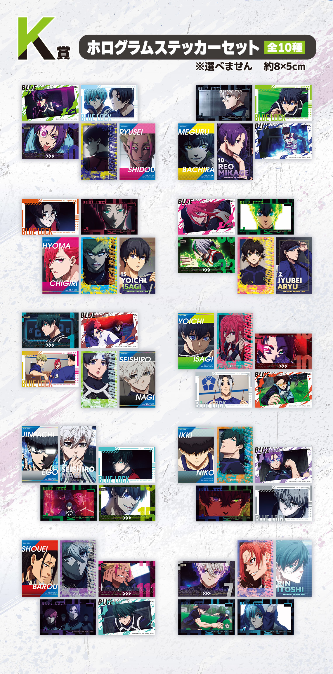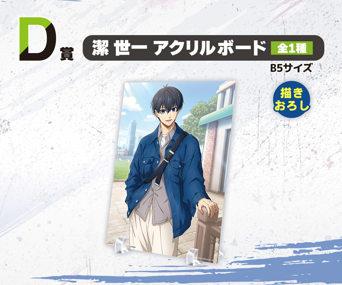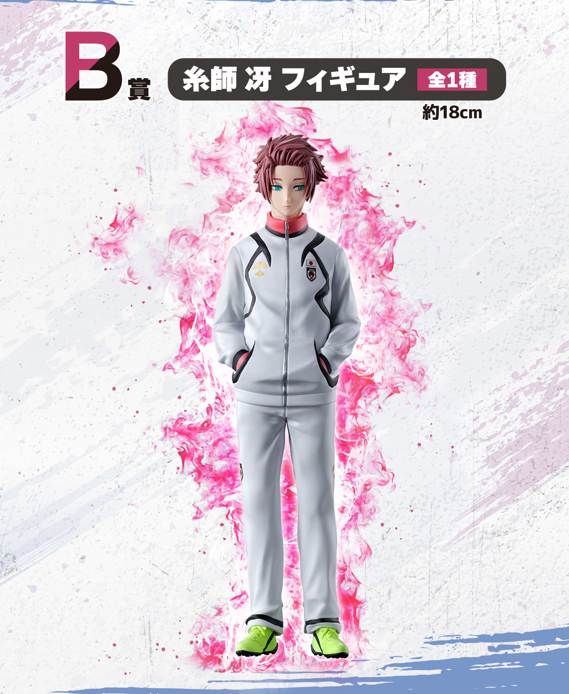 「BLUE LOCK 藍色監獄 決戰的覺悟」,收錄有 A ~ K 賞+最後賞等豐富的獎項,共有三款角色模型:A賞 糸師 凛、B賞 糸師 冴,以及首次在一番賞登場的 C賞 士道 龍聖!另外則是專為一番賞繪製的 B5 尺寸壓克力板:D賞 潔世一、E賞 凪 誠士郎、F賞 糸師 凛、G賞 冰織羊,休閒的私服造型有夠香~H賞與I賞為 Q 版的SoGyutto壓克力立牌A、B,以及Q版吊飾、貼紙套組等精彩周邊,最後賞的原創插畫畫框套組也不能錯過!