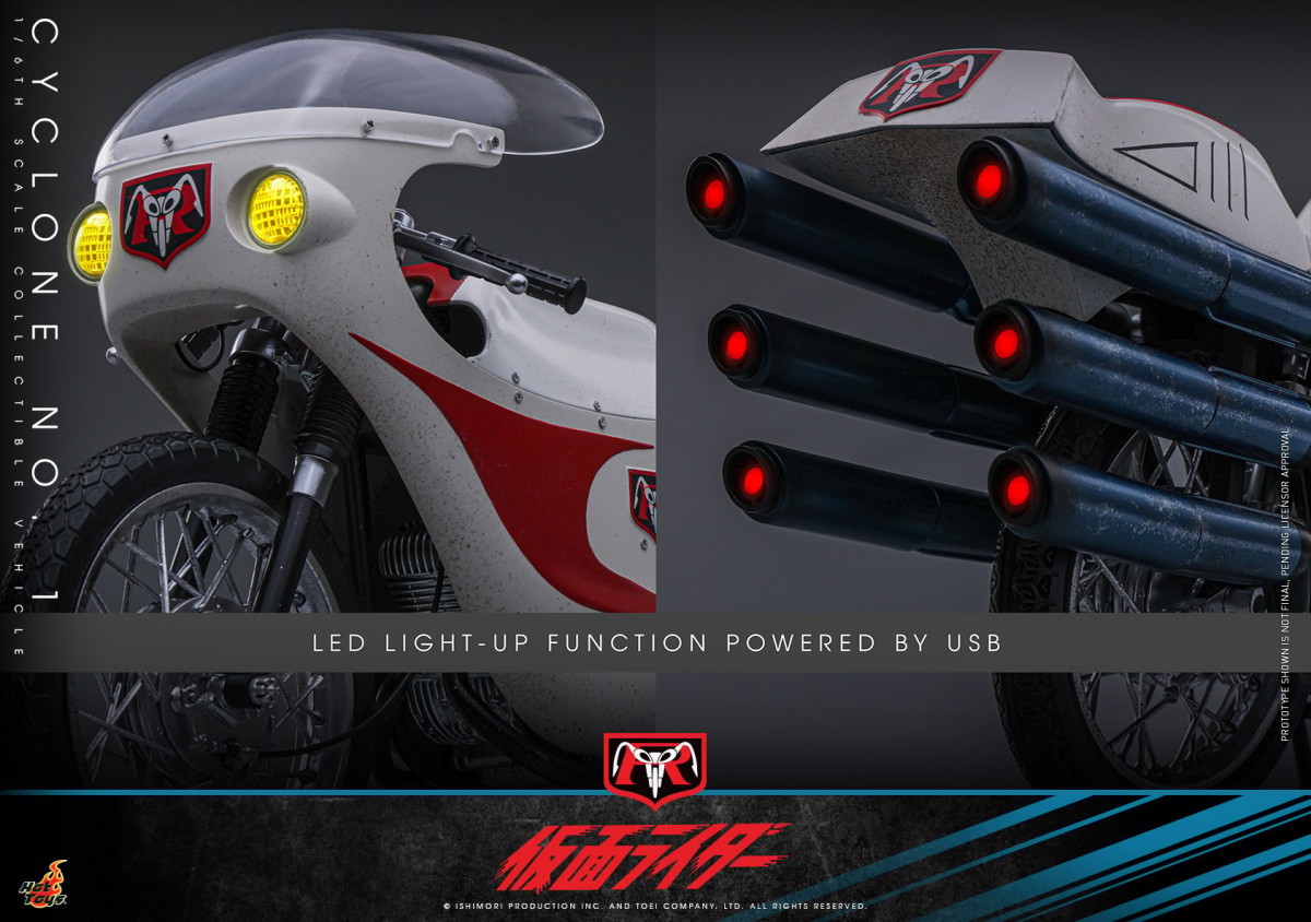 這次的另一大看點還有 1 號的愛車——旋風 1 號!獨立販售參考售價為 290 美元,全長約 35.5 公分,精確的按照 1/6 比例製作,還原旋風 1 號在作品中的模樣,呈現出高度精緻的機械細節,配備可運作的彈簧懸吊系統以及可旋轉的橡膠輪胎,前燈與尾燈皆作有 LED 發光功能,並以精湛的技術塗裝舊化效果,擁有著決不遜色於假面騎士 1 號本體的驚艷細節!這絕對是要一組買起來的,不然 1 號就沒有辦法順發變身了!