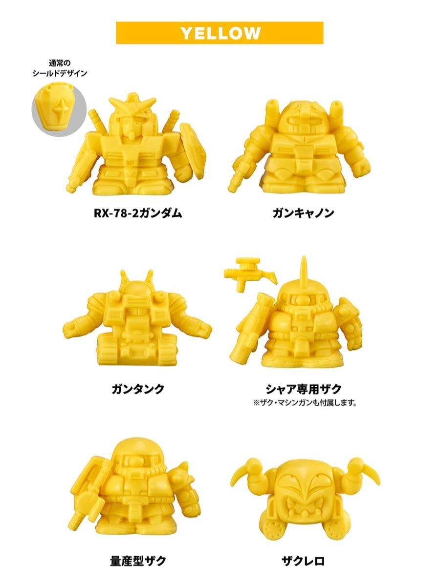 收錄有:RX78FRGMT GUNDAM(BLACK)、RX78FRGMT GUNDAM(WHITE)兩款黑白經典配色,FRGMT 閃電LOGO的盾牌是本次合作的原創設計!另外還有紅、藍、黃三種配色的:RX-78-2鋼彈、鋼加農、鋼坦克、夏亞專用薩克、量產型薩克、薩克雷洛,尺寸約高 28mm ,可愛的 SD 比例與橡皮擦般的單色,很有童年復古的味道~
