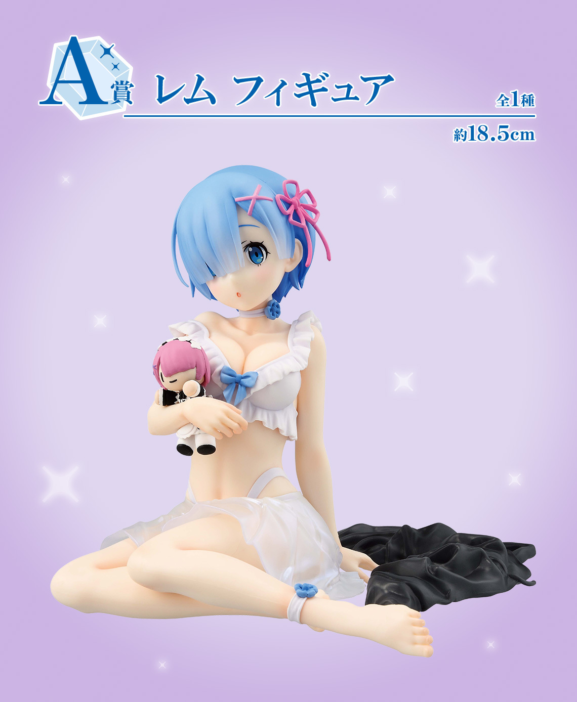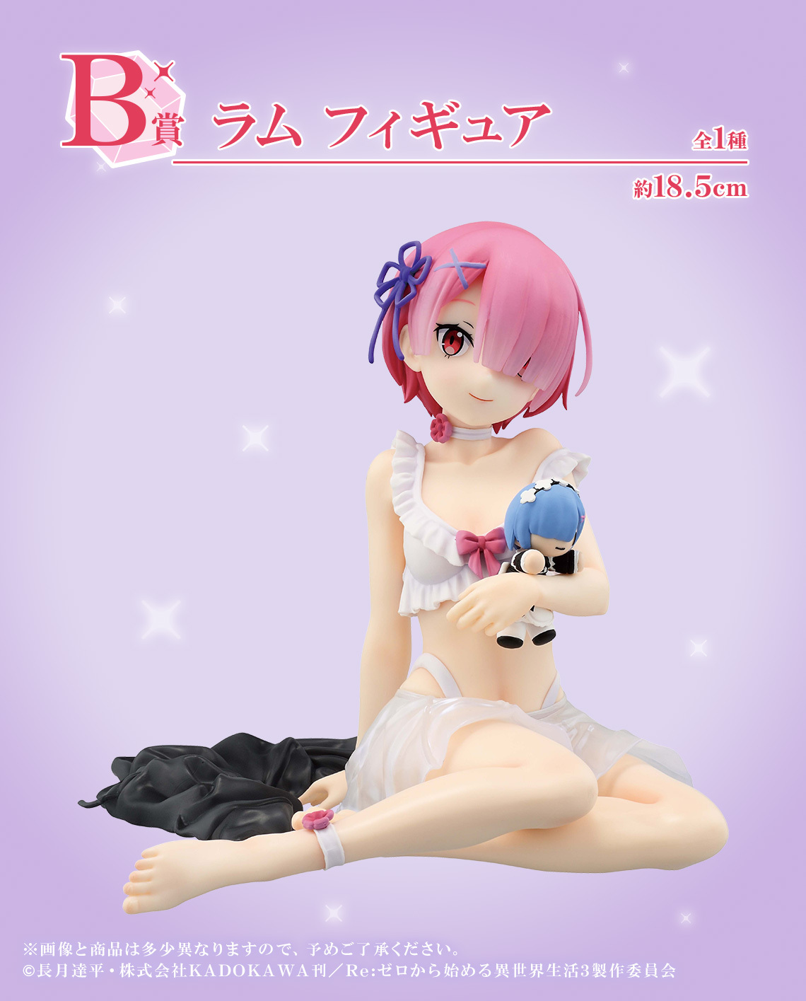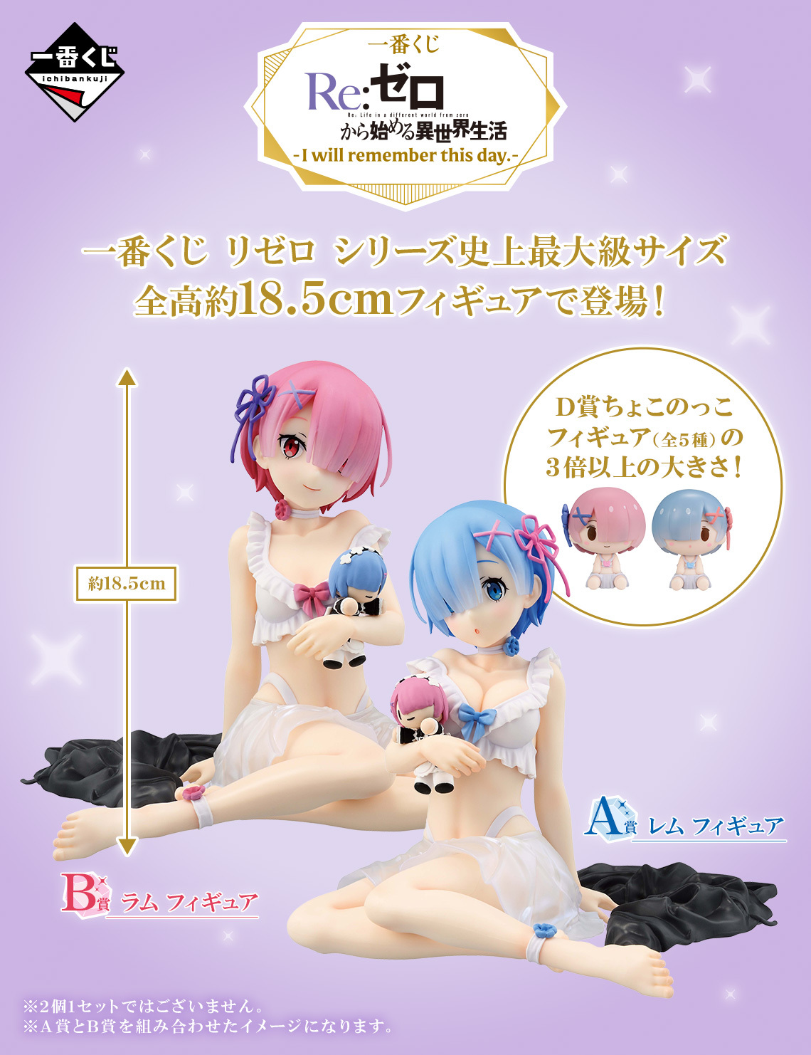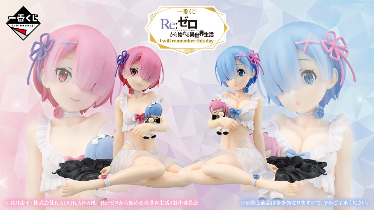 「一番賞 Re:從零開始的異世界生活-I will remember this day.-」,收錄兩款角色模型—系列一番賞史上最大尺寸的 A賞 雷姆、B 賞拉姆,坐姿就達 18.5 公分高,性感的蕾絲睡衣和手上抱著的娃娃超級可愛~另外還有C賞 金屬畫板、D賞Chokonoko Q版模型、E賞玻璃杯、F賞毛巾組合、G賞壓克力吊飾、H賞、壓泡麵墊等豐富的獎品,最後賞則是1/3比例的Art Scale的黑貓雷姆!