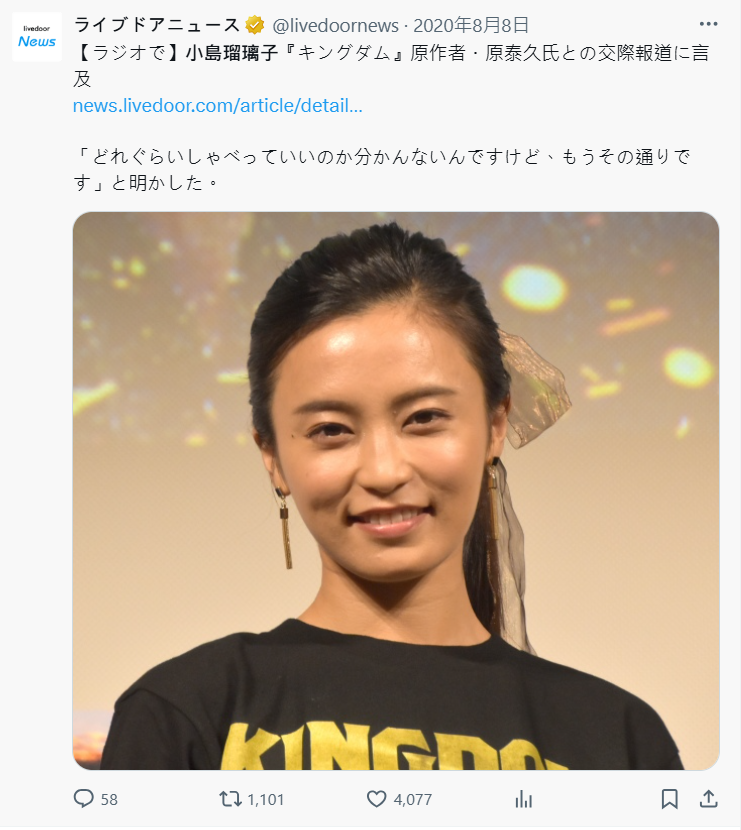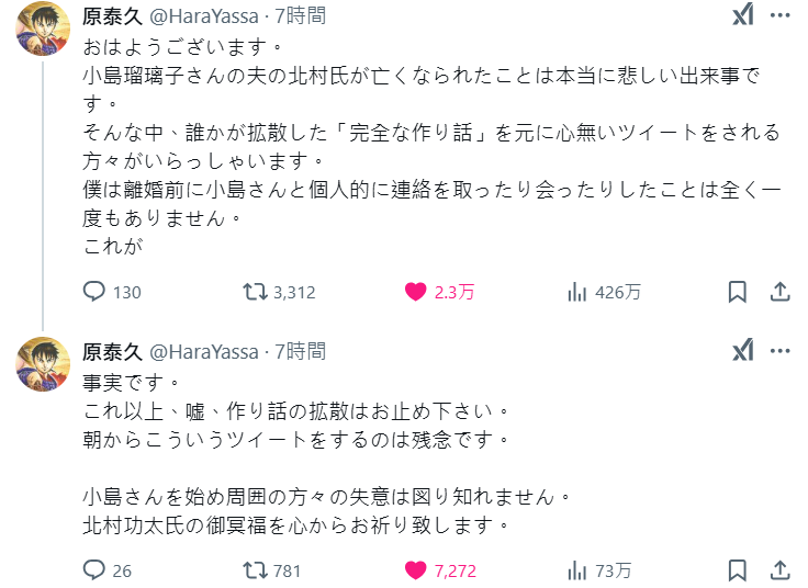 原泰久發文表示:「早安。得知小島瑠璃子小姐的丈夫北村先生離世,這是一件非常令人悲傷的事情。然而,網路上卻有人基於『完全的虛構故事』發表惡意推文,這讓人感到遺憾。」