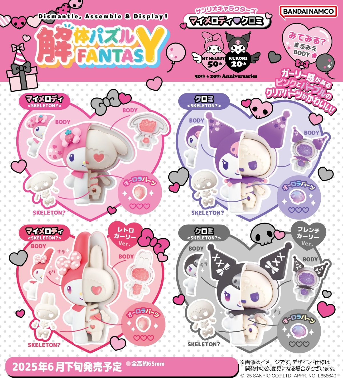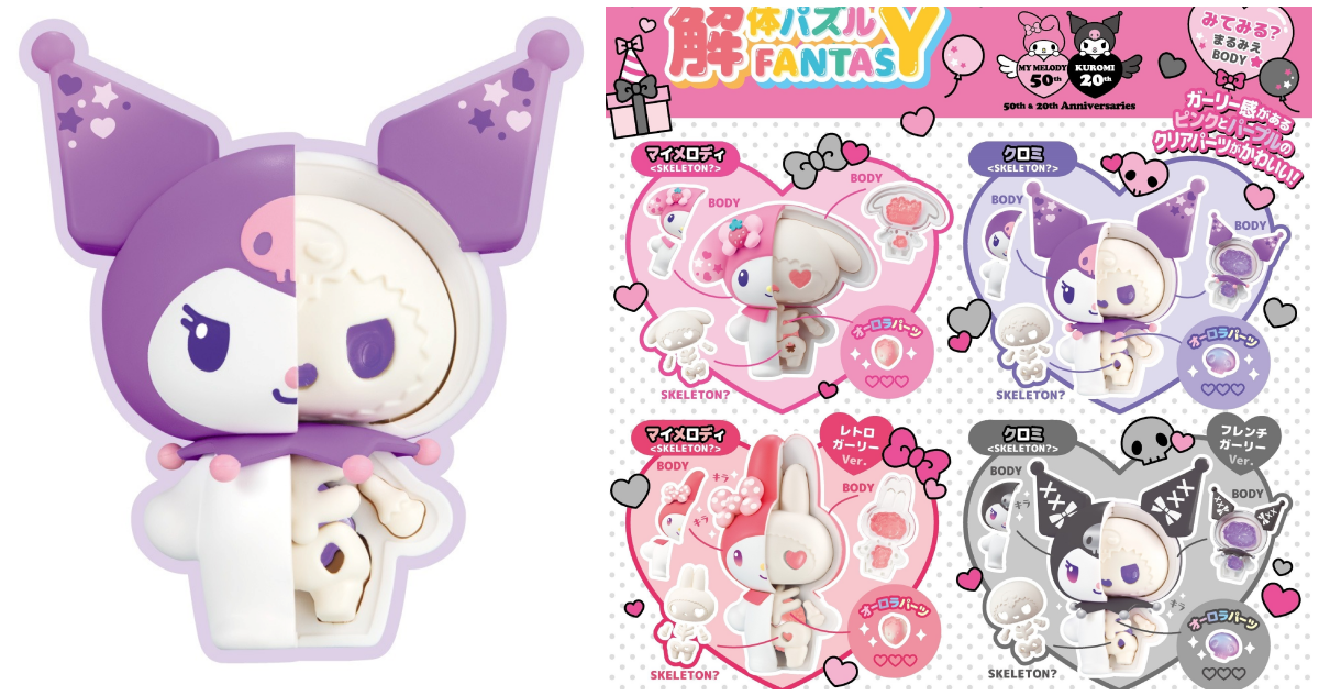 為慶祝美樂蒂出道 50 週年、酷洛米誕生 20 週年,特別推出「解體拼圖FANTASY 三麗鷗 美樂蒂・酷洛米」,以約 6.5 公分的小尺寸再現美樂蒂與酷洛米的可愛身影~四種款式分別為:垂耳的粉紅色美樂蒂、紫色酷洛米、美樂蒂、黑色酷洛米,外表採用更加繽紛華麗的特別規格:耳朵末端的愛心星星小圖樣、頭上的蝴蝶結也有不同的塗裝;透明的內臟帶有軟糖般粉嫩色系的夢幻感~實在是可愛到骨子裡!