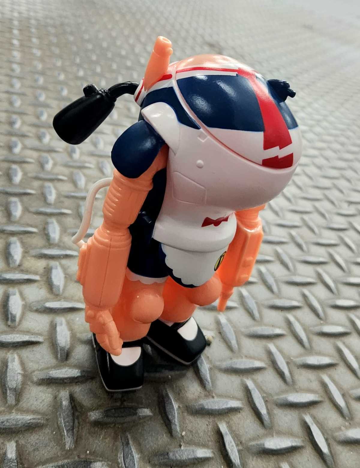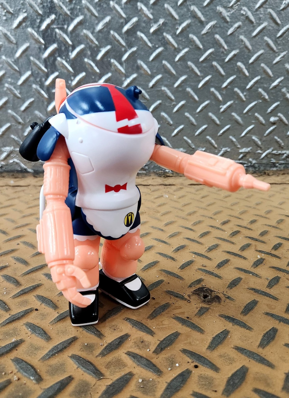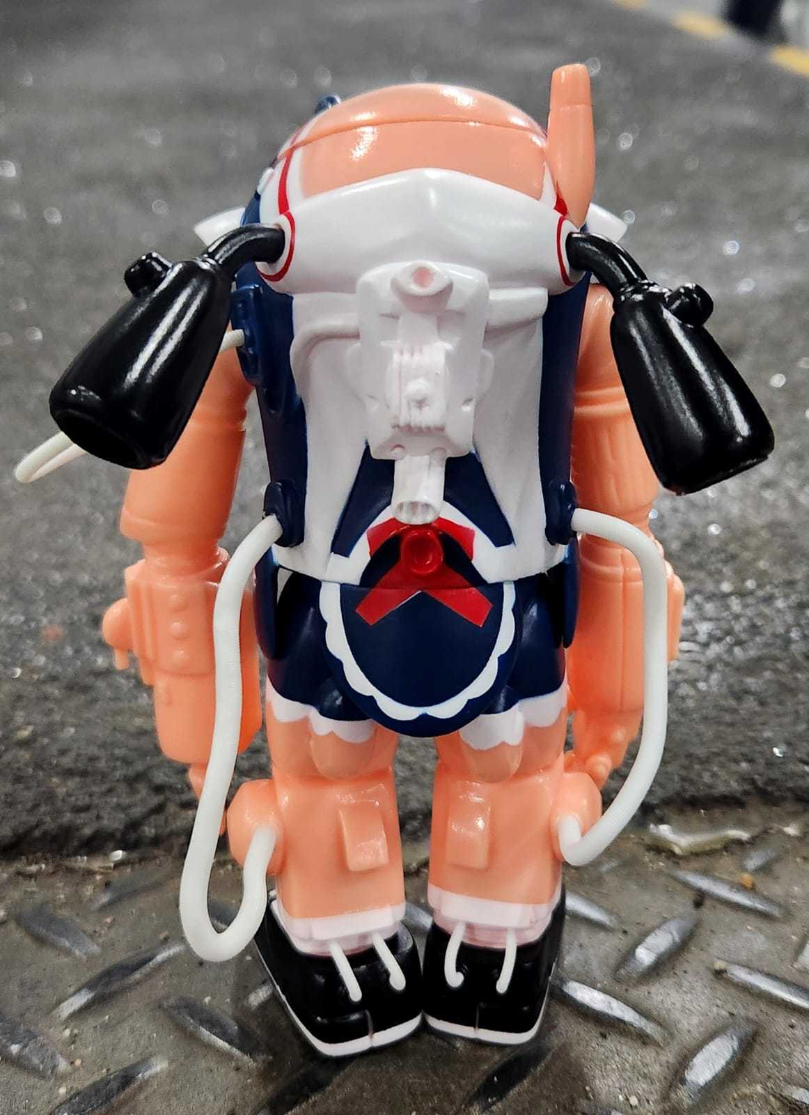 「超級戰鬥裝甲」(Super Armored Fighting Suit, S.A.F.S.)出自橫山宏老師原創的 SF 系列作品《Maschinen Krieger》(簡稱 Ma.K),在故事中是「地球獨立政府傭兵軍」所使用的動力甲服。本次連動的「S.A.F.S.(機器子 Ver.)」高約 16.5 公分,以基礎的 S.A.F.S. 為基底,為動力甲服新增機器子雙馬尾造型的火箭推進器,並在塗裝上分色還原出女僕裝配色,不知道是不是錯覺,這款 S.A.F.S. 膝蓋的零件也看起來特別突出(?),看似荒謬的氛圍意外的與《我與機器子》作品調性非常吻合!此外本次的夢幻聯動還推出了另外兩件商品——「機器子和蟹男」,可以與 S.A.F.S.(機器子 Ver.)一同擺設!