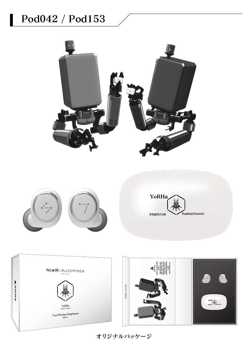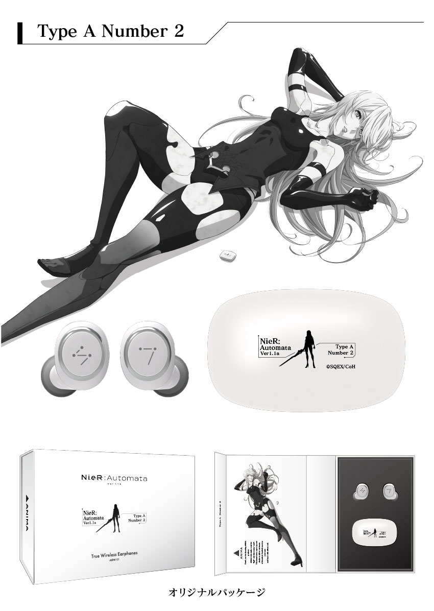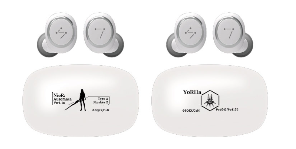 採用型號 ANIMA AOW01,當初就是以聆聽動漫歌曲打造的藍芽耳機。此次合作款有「A2」款和「Pod042 / Pod15」款兩種型號,充電盒分別印有 A2 角色的剪影以及印有寄葉(ヨルハ,YoRHa)標誌以及代表角色的文字,耳機本體則以白色搭配銀色的樣貌,搭配符號圖案來表現