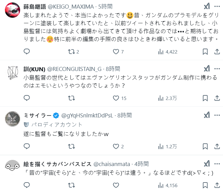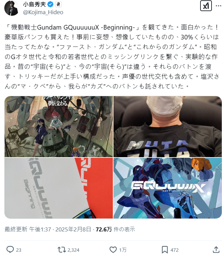 而知名遊戲設計師小島秀夫今日 ( 2/8 ) 也在個人 X 上發表到戲院看完《機動戰士Gundam GQuuuuuuX-Beginning-》的心得,不少粉絲都好奇他對這部作品的看法,也成為 X 上網友的話題。
