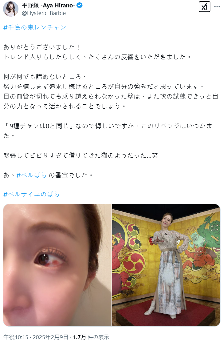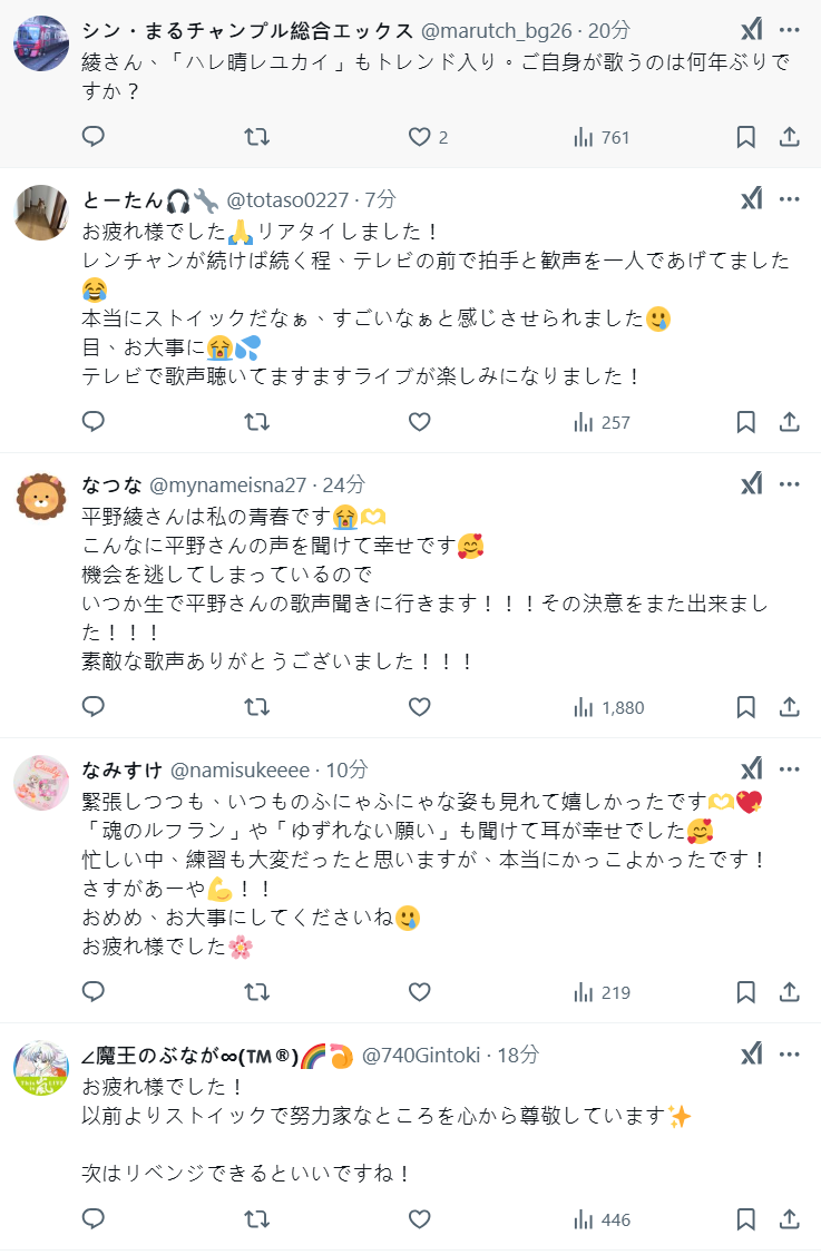 平野綾個人 X 上也對這次出席節目登上趨勢收到超多回饋深表感謝,我覺得自己的優勢就是 不管遇到什麼都不輕言放棄,還有願意付出努力、持續追求目標的決心。