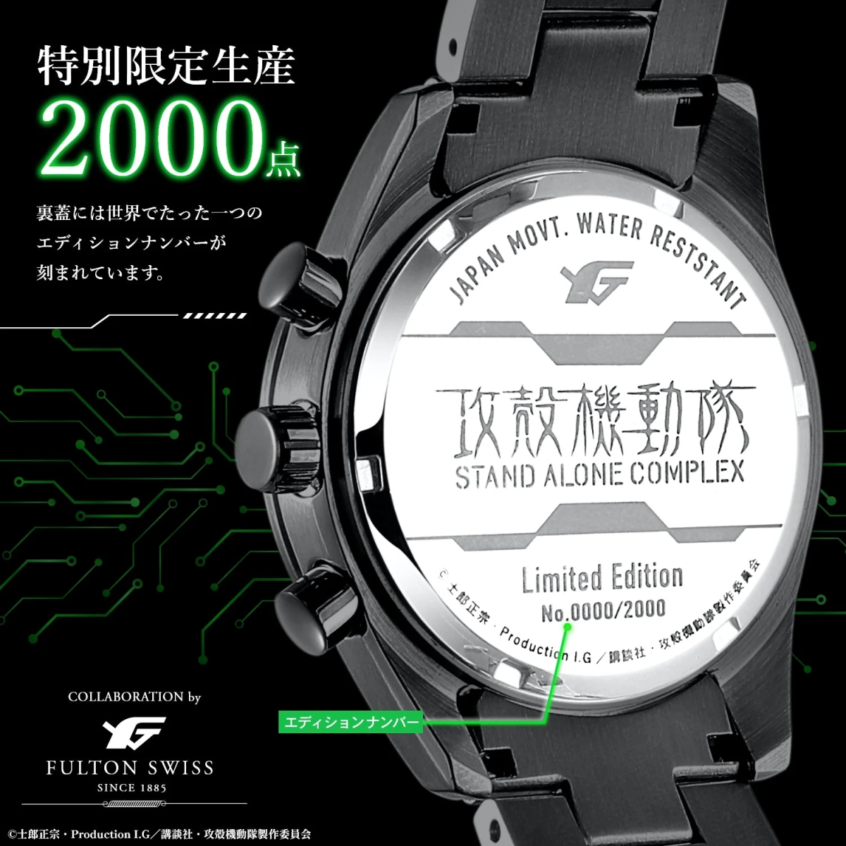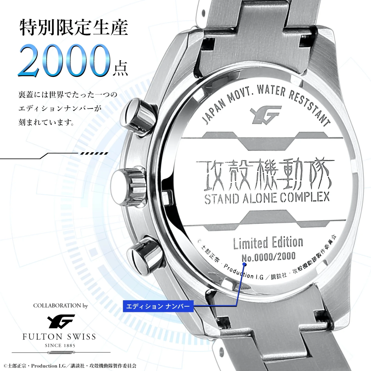 專門推出各種 ACG 相關周邊,時常推出精緻錶款的品牌 Fulton japan,近日宣布將與經典的電視動畫《攻殼機動隊S.A.C.》聯名,推出兩款以作品為特色的聯名手錶。分別限量 2,000 副,將於 2025 年 2 月 24 日起正式開放預購,預計 7 月中旬正式發售。