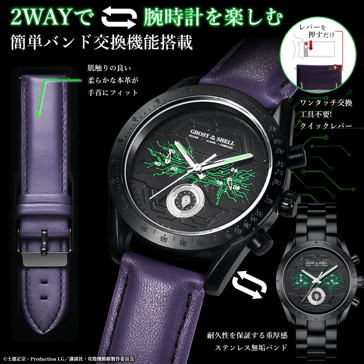 購入皆配有紫色真皮的替換錶帶,色系採用草薙素子的髮色為靈感。