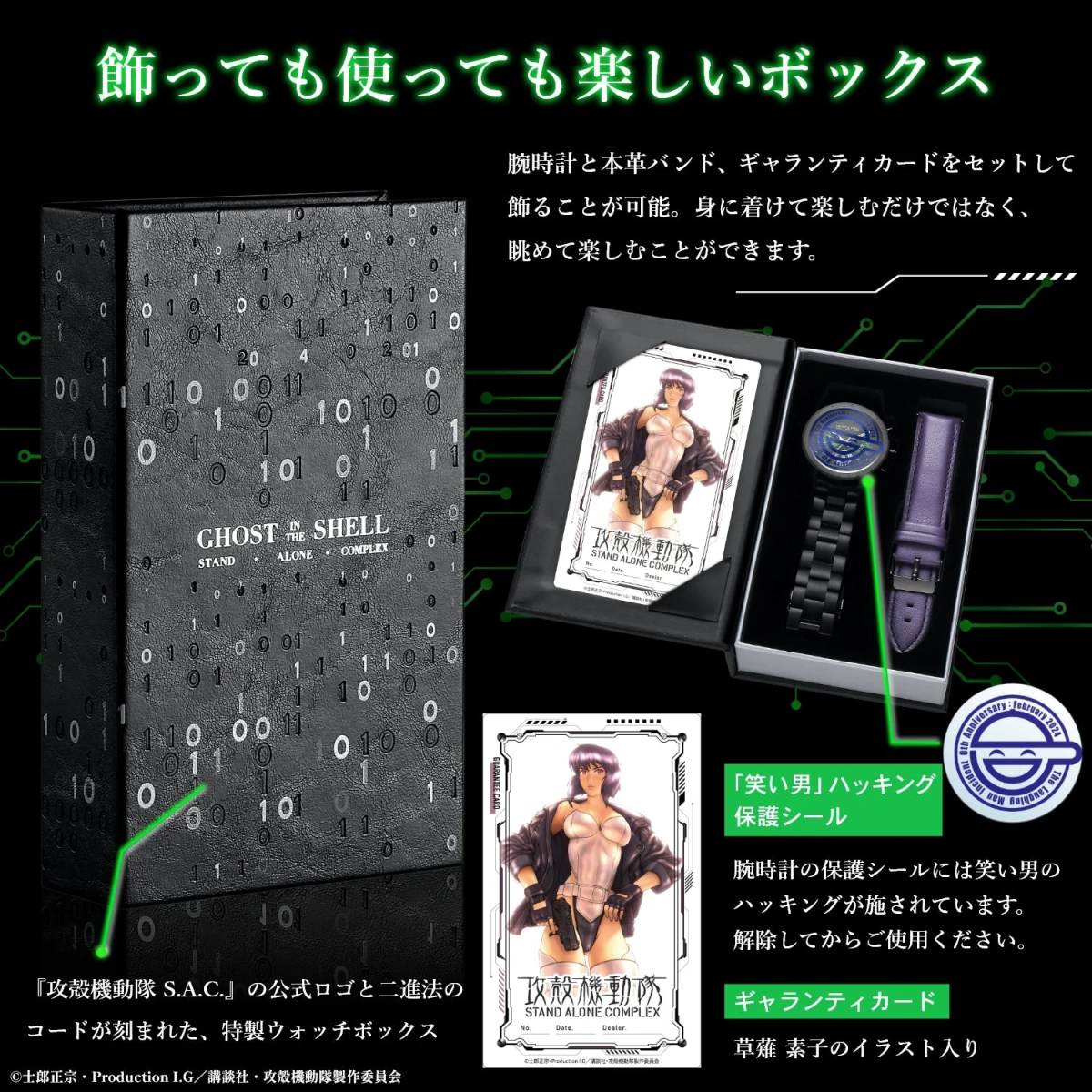 並配有專屬的盒裝,以二進位法的數字「0」與「1」佈滿盒身,並附有「笑臉男」的表面保護蓋,以及草薙素子插圖的保證卡。