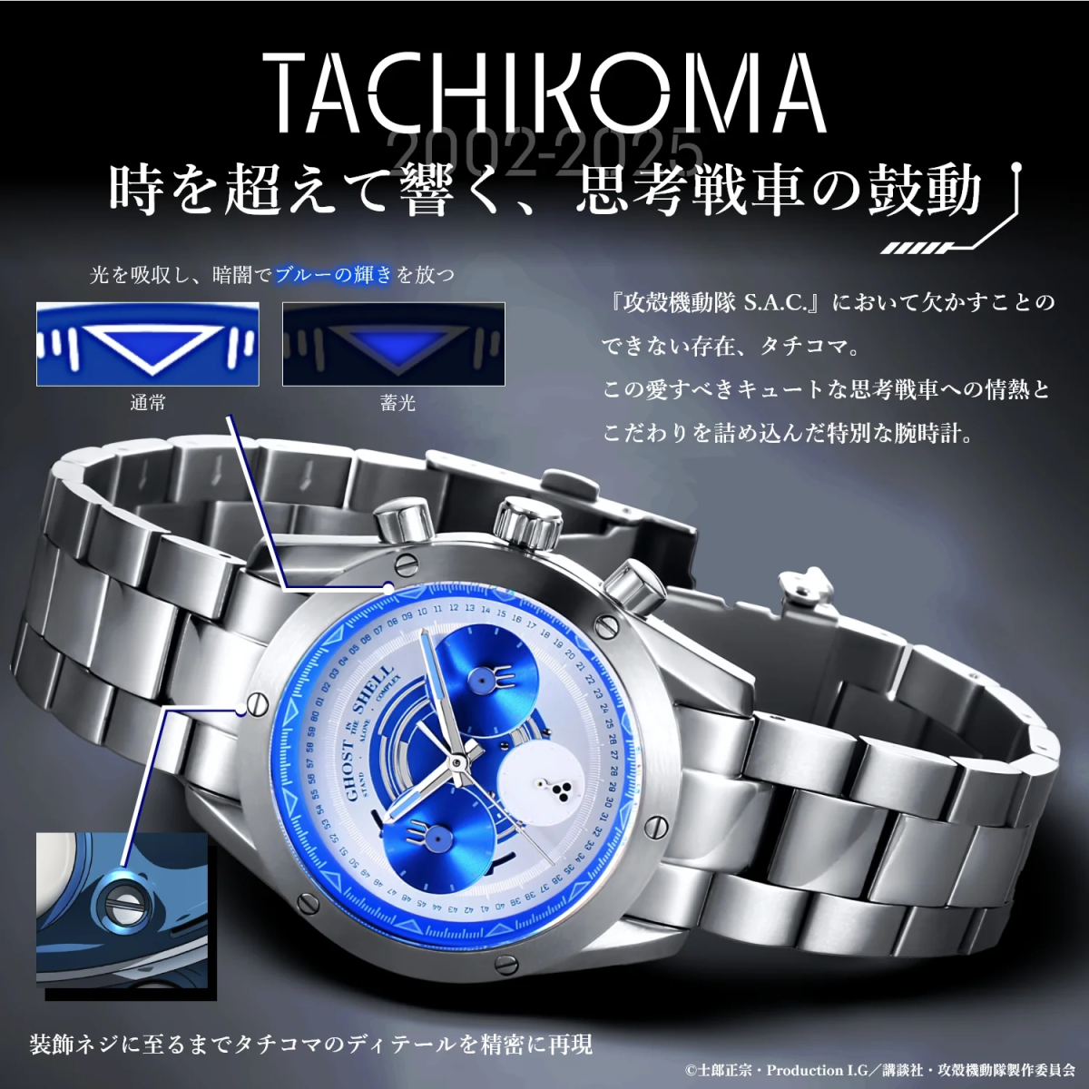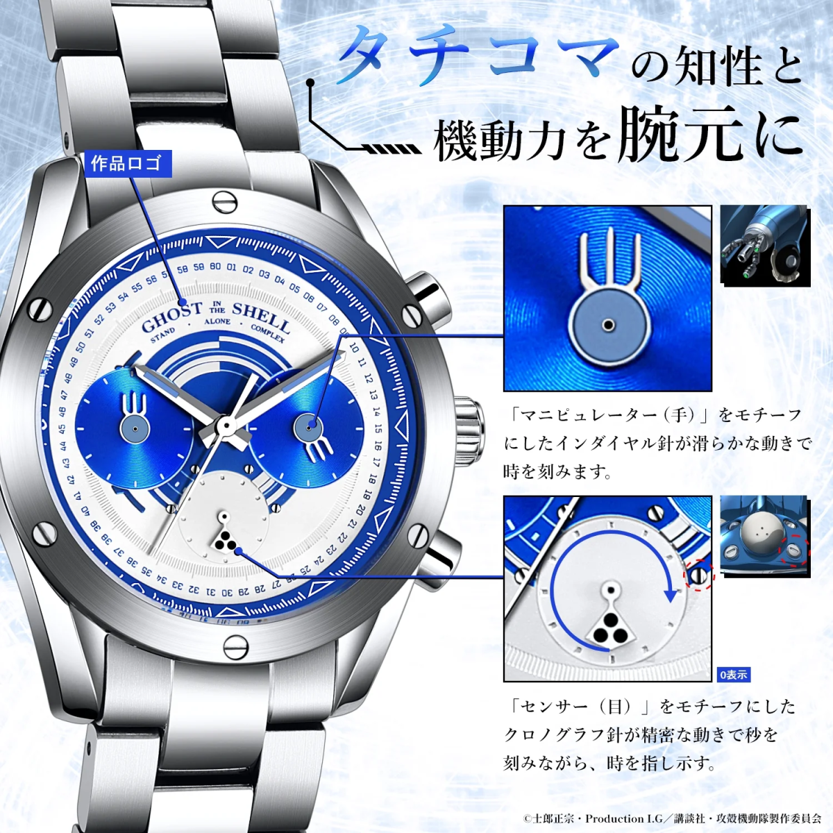 這次推出的兩款手錶,分別以主角草薙素子以及招牌機械塔奇克馬來當作主題,將兩者元素與作品的世界觀巧妙融入在錶款設計之中,打造出帶有機械未來感又不失配戴實搭的精美手錶。