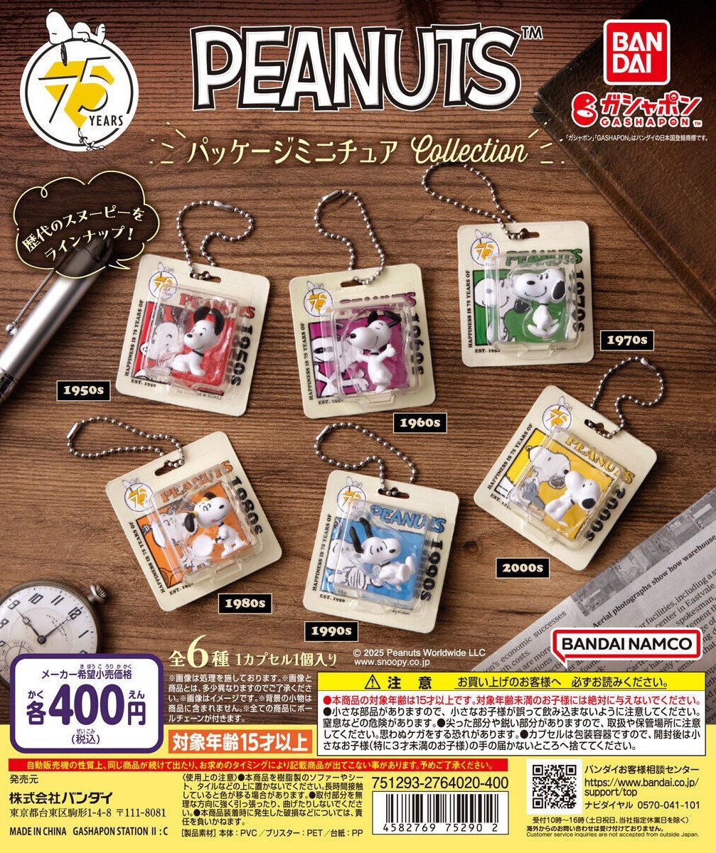 為紀念 PEANUTS 漫畫誕生75週年所推出的紀念商品『PEANUTS 史努比迷你包裝系列』轉蛋,將 1950s~2000s 歷代的史努比角色以吊卡包裝的微型吊飾形式立體化。在包裝卡上有 75 週年紀念LOGO 和史努比漫畫插畫,可愛的模型玩具也超迷你再現!收藏一整套超可愛~