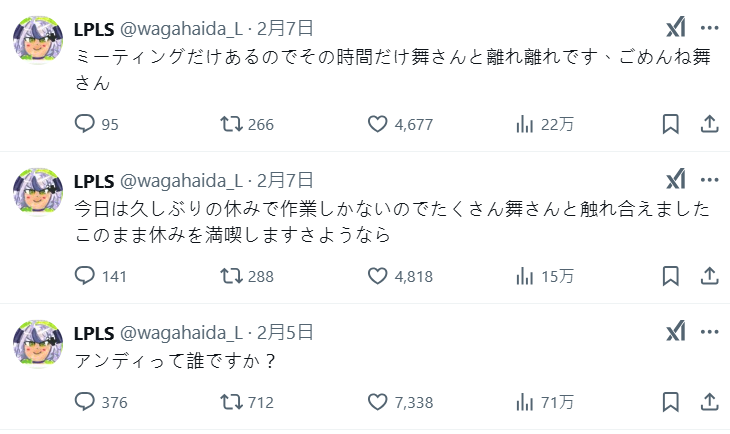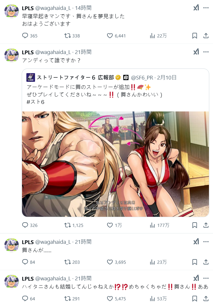 結果就是在個人的副 X 帳號上,瘋狂發文展示自己對不知火舞的依戀,還呼喊自己夢見的不知火舞,回家居然沒看到不知火舞,安迪到底是誰等言論,真的像是戒斷症候群了 www。