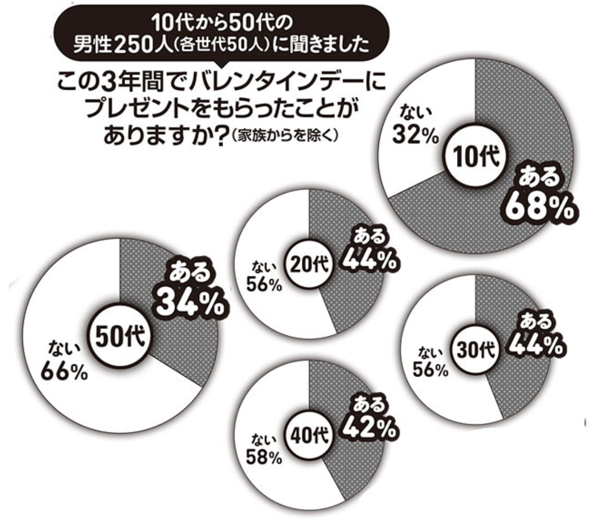 根據對 10 到 50 歲世代區間的男性,分別取樣 50 人的調查中,發現 50 代男性有近 2/3 這三年完全沒收到巧克力,一些受訪者表示:「疫情影響很大,當時連交文件都怕,更別說送巧克力了。感覺這個文化會像賀年卡一樣慢慢消失吧。」、「20 年前還要上網查白色情人節該怎麼回禮,現在沒這個煩惱了,輕鬆多了。」