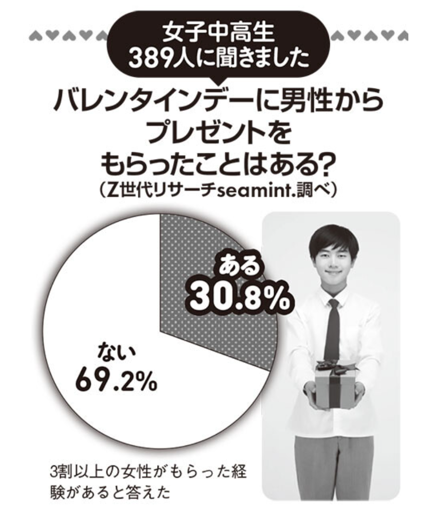 根據調查,女高中生在情人節收到男生贈送的巧克力比例,也上升至三成。現在的 10~20 代日本年輕人不太受傳統性別觀念影響,情人節不一定是女生向男生告白的日子,更多的是表達情感的場合。
