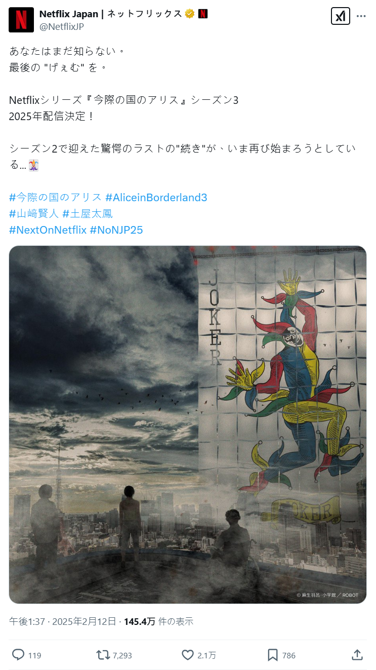 改編自日本漫畫家麻生羽呂的同名漫畫,並由Netflix開發的日本電視劇《今際之國的闖關者》(今際の国のアリス),於 2023 年 9 月就宣布第三季的消息。官方於今日 ( 2/12 ) 也正式宣布,第三季將於 2025 年 9 月開播並釋出視覺圖,擔任本作主演的山崎賢人、土屋太鳳依舊續演。