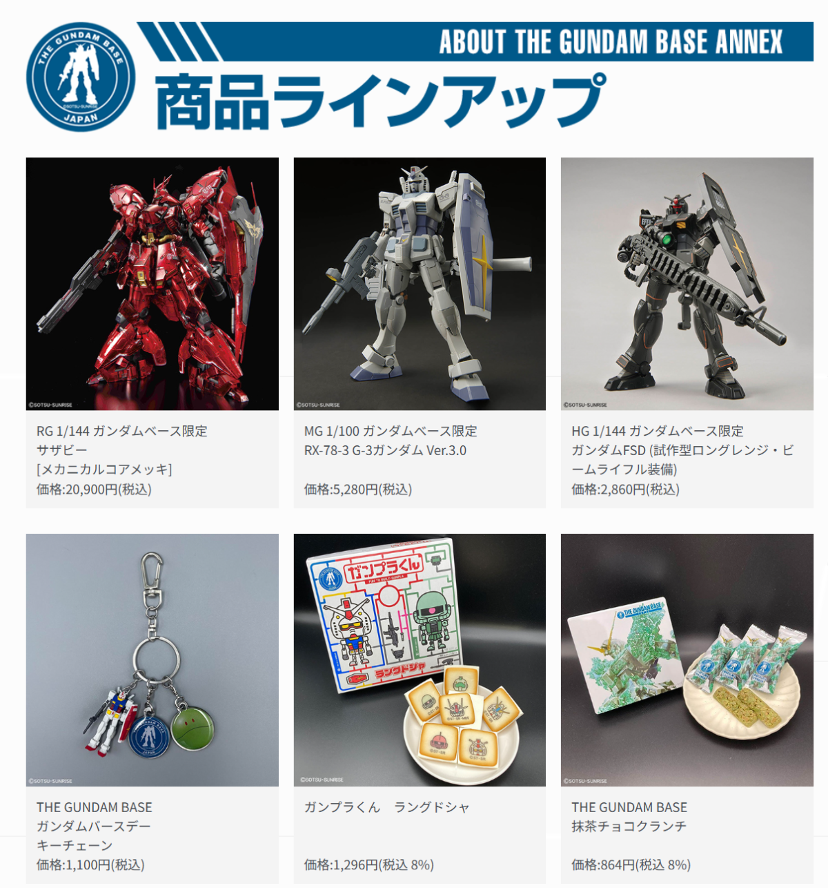 當然少不了的就是限定商品,包含 :「RG 1/144 GUNDAM BASE限定 沙薩比[機械核心電鍍]」、以及「鋼普拉君 奶油夾心餅乾」等多款鋼彈相關周邊,當然也有服飾、文具、雜貨、零食等,讓粉絲們能找到最適合自己的鋼彈收藏或伴手禮。。