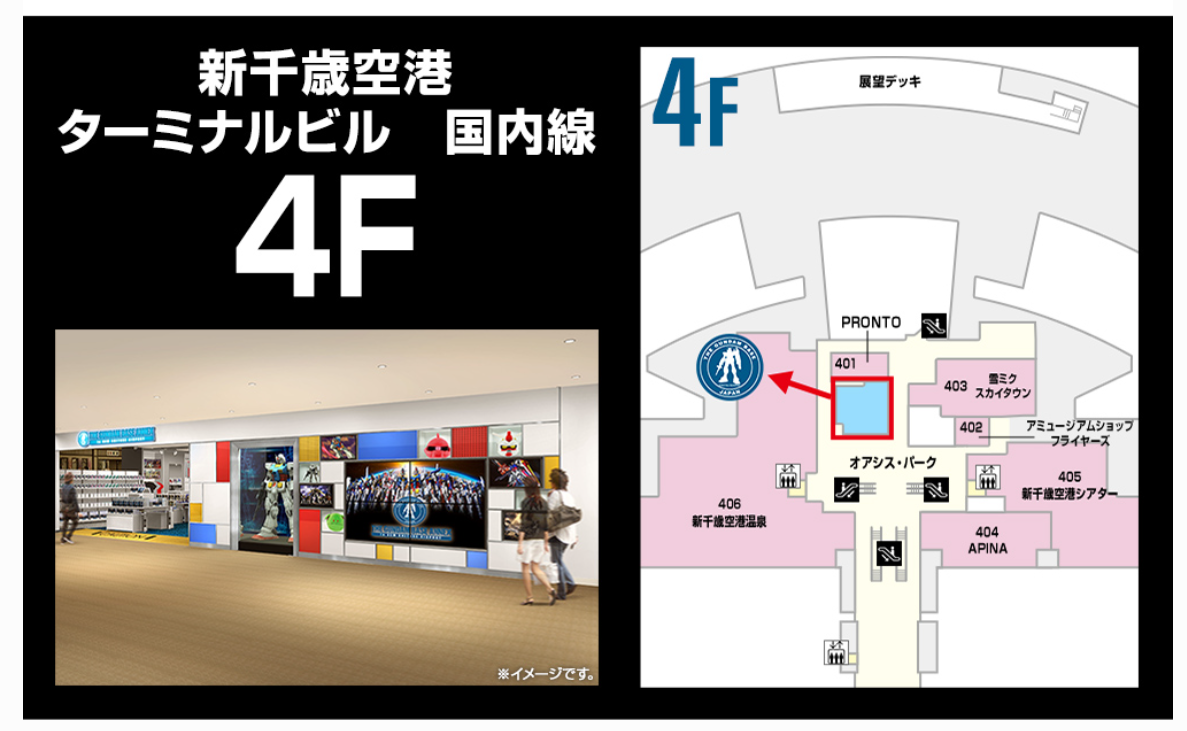 在國內線側通道,將展出1/10比例的 RX-78-02 鋼彈(THE ORIGIN Ver.)立像,同時透過多螢幕播放鋼彈相關影片,讓旅客在機場內也能感受滿滿的鋼彈魅力。