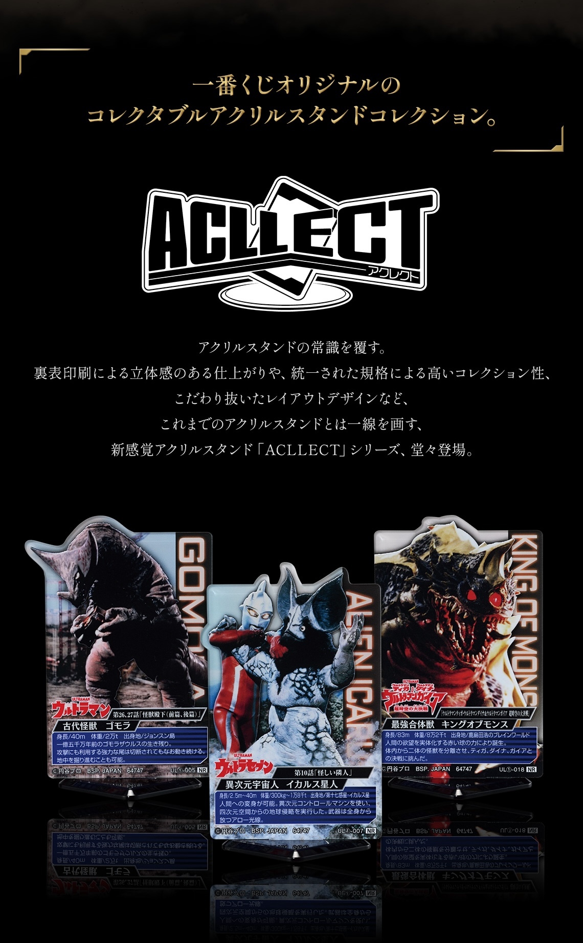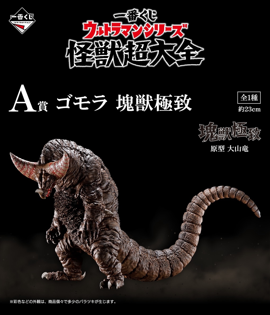 本次的「超人力霸王系列 怪獸超大全」以系列登場的各種人氣怪獸為主軸提供A~F、最後一賞與雙重中獎賞等不同級別的賞品。先前搶先公開的A賞與雙重中獎賞為在沿襲劇中設定與造型並加入原型師自我詮釋的「塊獸極致」系列推出的「哥摩拉」!在保有哥摩拉經典形象的同時雕刻呈現出了驚人的生物感造型細節,手腳的肌肉感、粗糙的表皮與兇狠的細節讓他散發出強大的魄力!