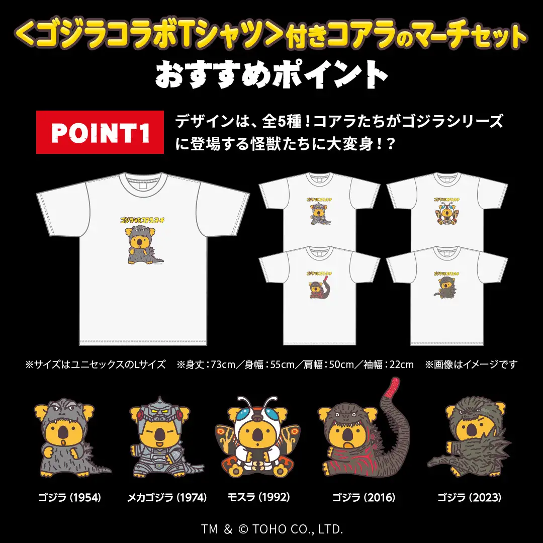 這次的第 2 彈聯名,以 70 週年的哥吉拉為主題,特別設計了「樂天小熊變身怪獸」的可愛迷你角色印在T恤上。T 恤設計靈感來自不同年代的經典作品,包含 : 初代哥吉拉(1954)、哥吉拉vs機械哥吉拉(1974)、哥吉拉vs魔斯拉(1992)、正宗哥吉拉(2006)、哥吉拉-1.0(2023),全系列共有 5 款設計可選!