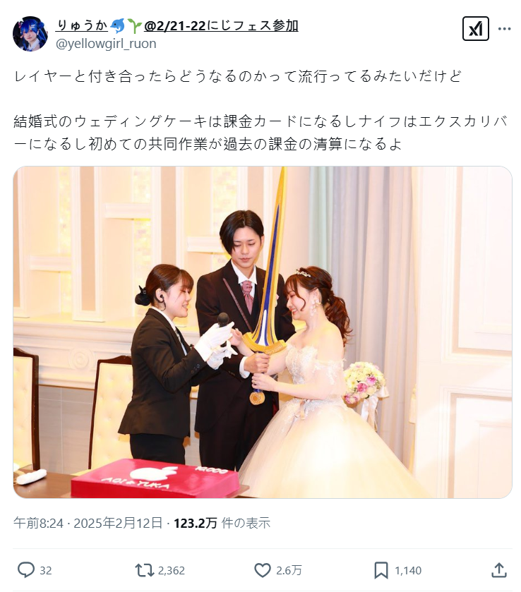嗯……大概就是婚禮蛋糕變成課金卡、蛋糕刀變成Excalibur,然後新人第一個共同完成的儀式,就是清算過去的課金歷史吧!