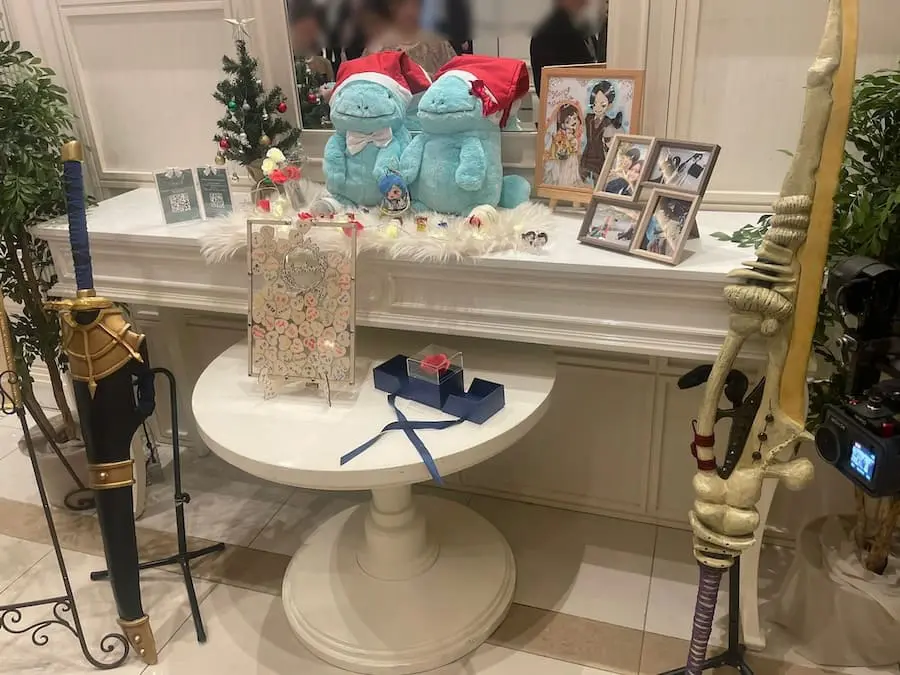 不只如此,他們在迎賓區擺放了兩人初次相識時的Cosplay道具—茨木童子的武器和渡邊綱的刀。婚宴上播放《FGO》的BGM,當播到抽卡音樂時,賓客們甚至開始喊「快來抽卡!」。