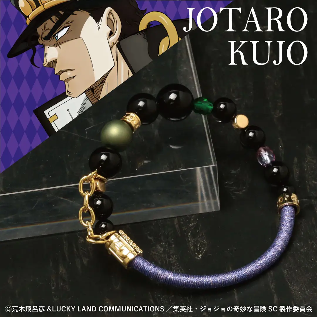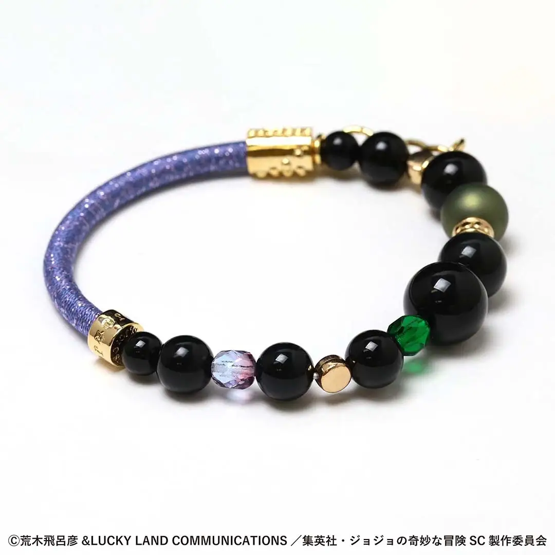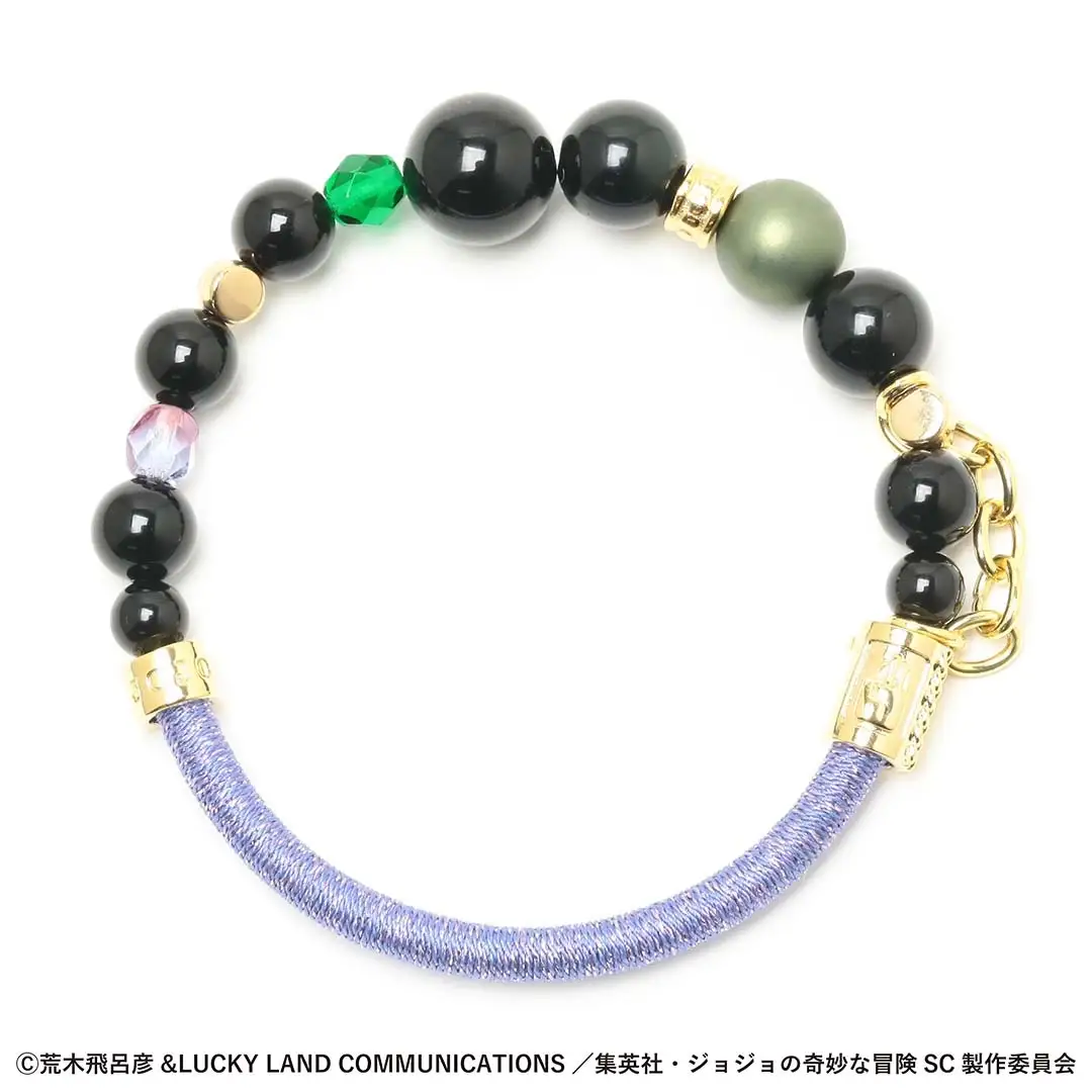 以承太郎的經典服裝為靈感,以黑色瑪瑙為主石,搭配象徵帽子與制服的金屬元素,手鍊上還特別融入承太郎標誌性的「鎖鏈」設計!點綴的綠色玻璃珠呼應他的瞳色,並加入象徵「白金之星」的紫色元素,展現獨特又華麗的效果。