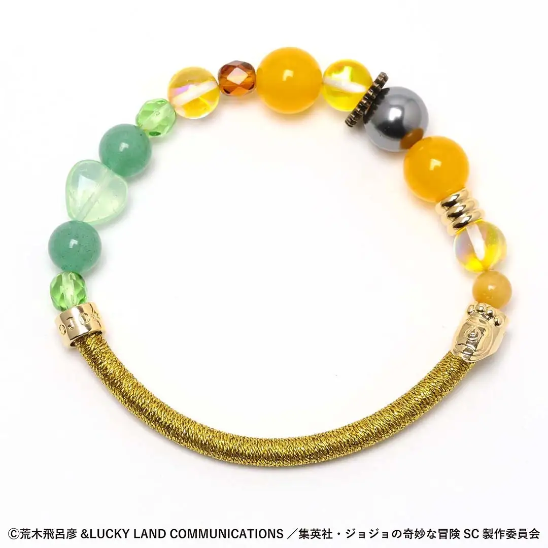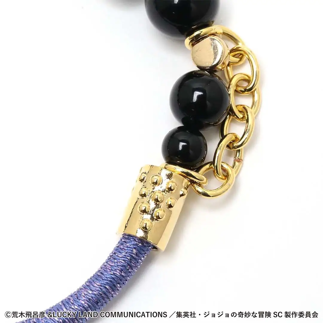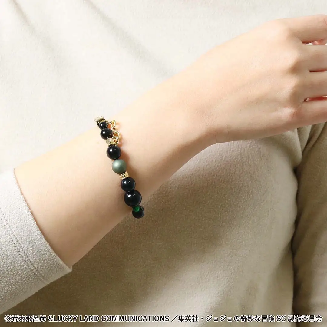以承太郎的經典服裝為靈感,以黑色瑪瑙為主石,搭配象徵帽子與制服的金屬元素,手鍊上還特別融入承太郎標誌性的「鎖鏈」設計!點綴的綠色玻璃珠呼應他的瞳色,並加入象徵「白金之星」的紫色元素,展現獨特又華麗的效果。