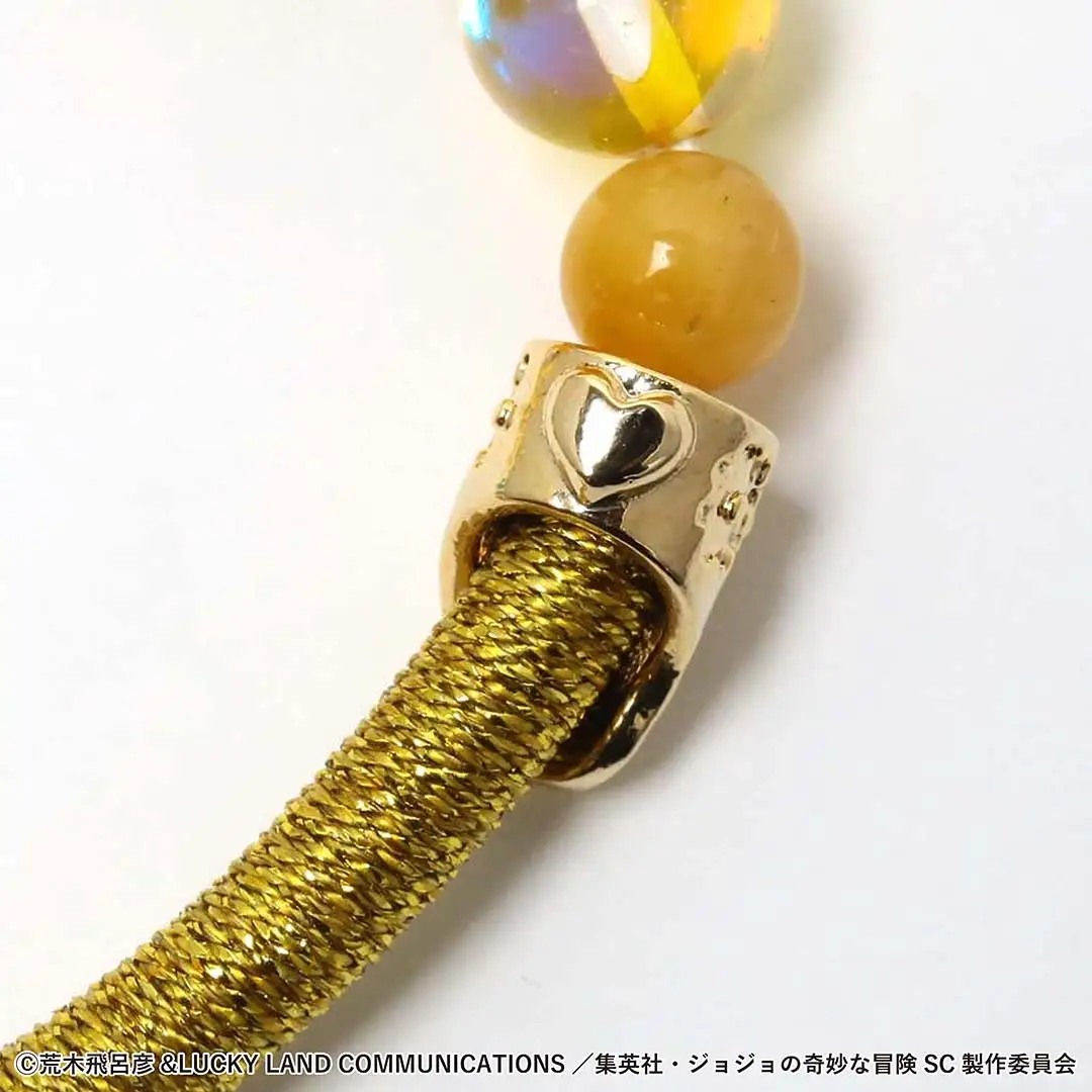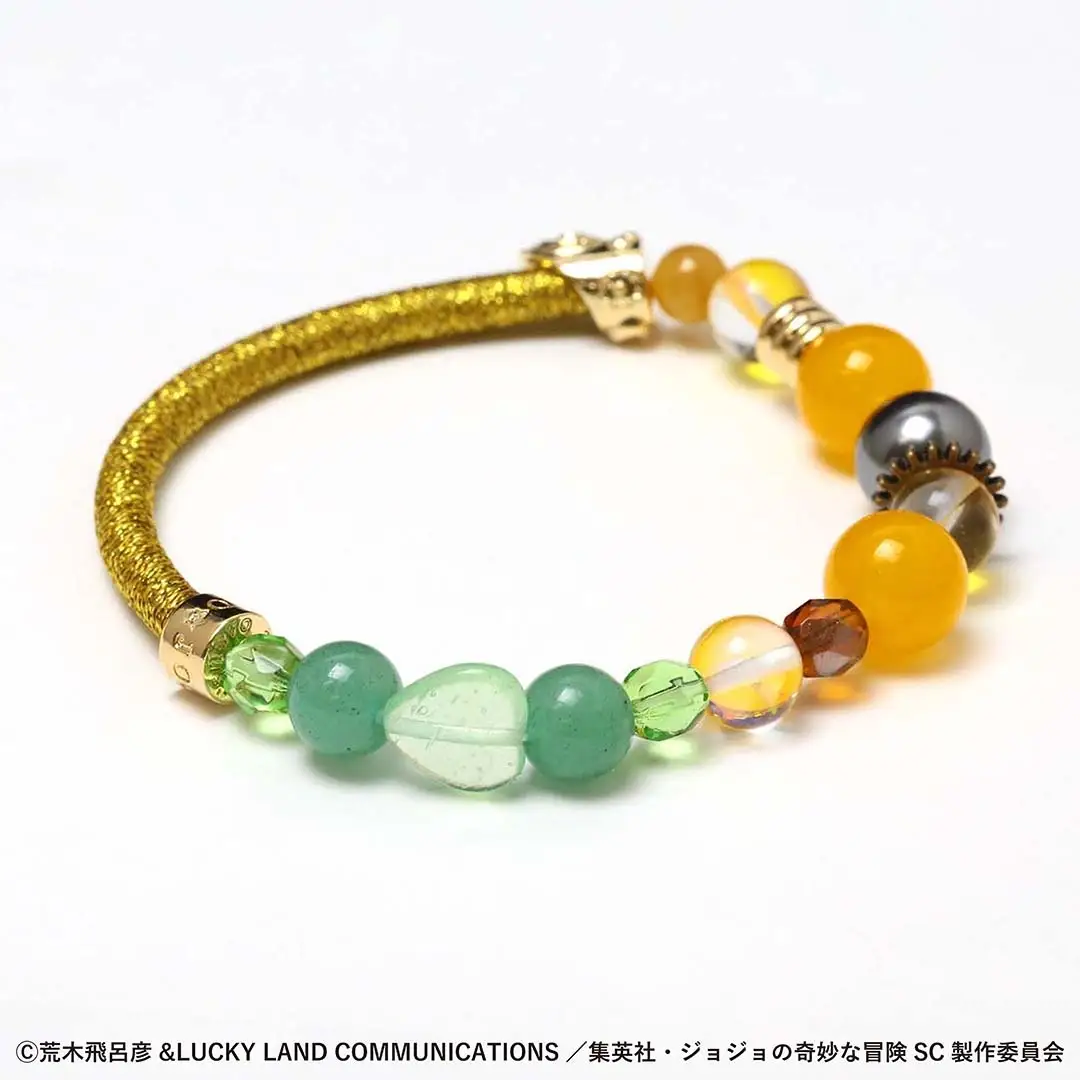 這款手鍊以DIO的氣質與招牌配色出發,選用了蜜糖黃玉髓(Honey Jade)、黃虎眼石(Golden Tiger Eye)與綠東陵石(Aventurine),營造出王者風範。設計上更巧妙融入心形玻璃珠、象徵「世界,The World」時停能力的齒輪,以及DIO手環造型的金屬飾件,細節完全不馬虎!