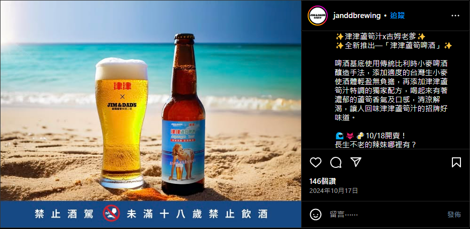 津津蘆筍汁,對大多數的台灣人來說,固然是家喻戶曉的一個飲品,即便沒有喝過它,也肯定聽過。但同樣有著金髮美女的「津津蘆筍啤酒」可就不一樣了,據悉這是津津蘆筍汁在2024年時,與「吉姆老爹啤酒工場」的跨界合作。