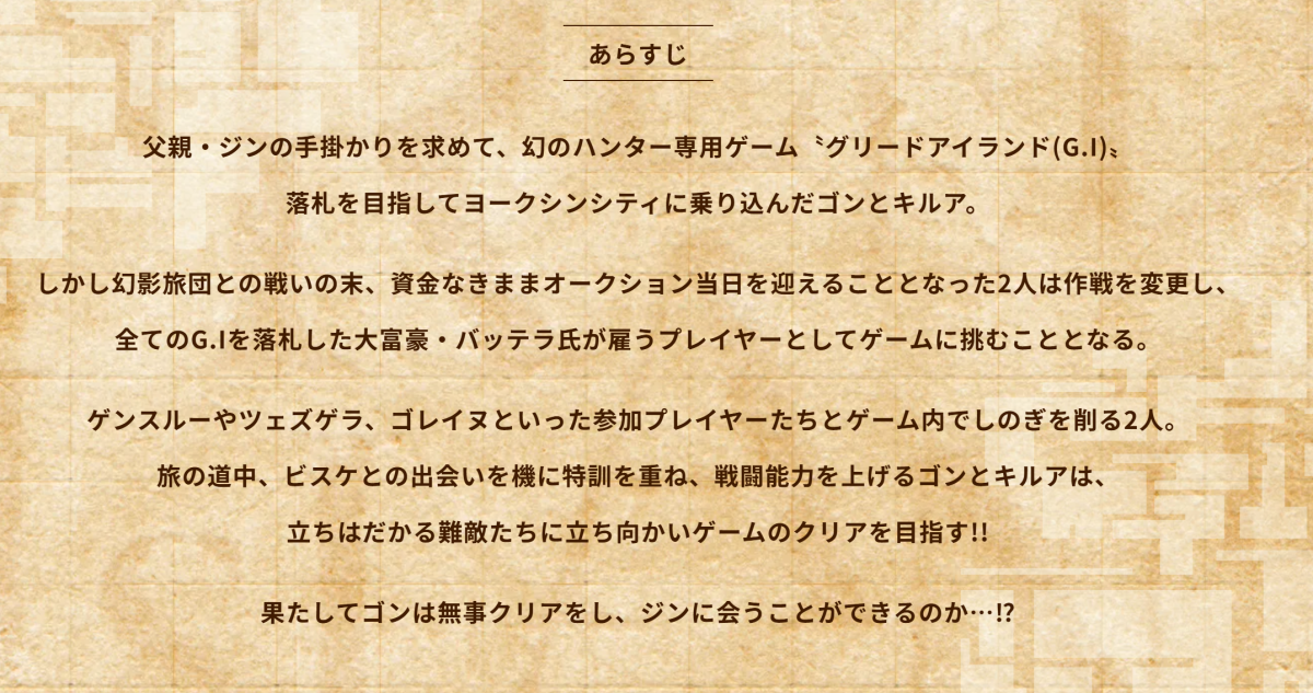 劇情延續第二彈舞台劇「友克鑫市篇」後,為了尋找父親「金」的線索,小傑和奇犽競標傳說中的獵人專用遊戲 「貪婪之島(G.I)」,以進入遊戲世界挑戰!在G.I裡,小傑和奇犽遭遇到炸彈魔「甘舒」、資深玩家「絕茲絕拉」、實力派獵人「果列奴」等高手。在這場生存遊戲的旅途中,他們遇見了比司吉,並在她的指導下不斷鍛鍊自己。隨著關卡越來越艱難,他們也逐步邁向遊戲破關的旅程,是否並找到父親「金」呢?