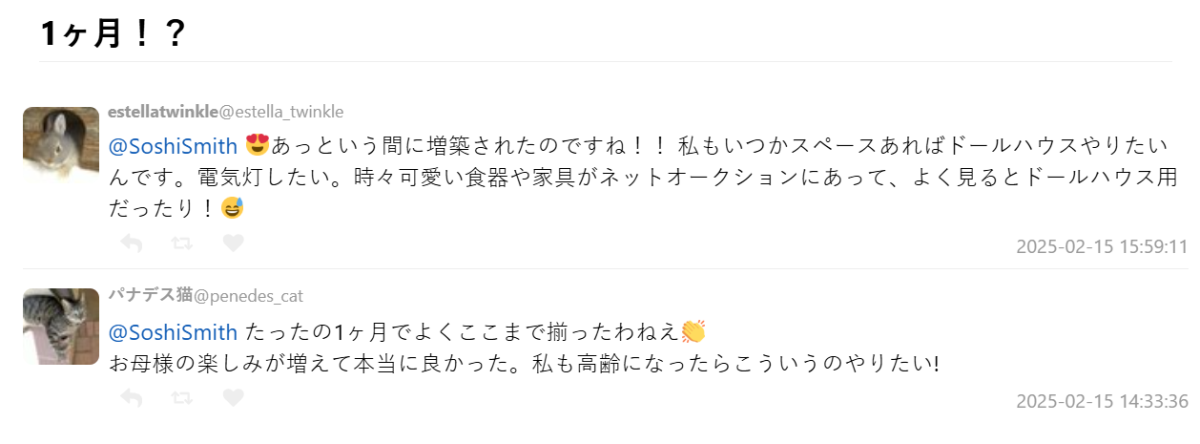 近日日本 X 上,有位推主分享自家已經 83 歲高齡的母親,居然有一天說:「我想試試做娃娃屋!」,於是他去二手店花了 500 日圓幫媽媽買了一棟二手的「森林家族」( Sylvanian Families ) 小屋。沒想到一個月後,居然這個二手屋的變化讓推主大為驚訝,分享到 X 上後也成為網民關注對象。