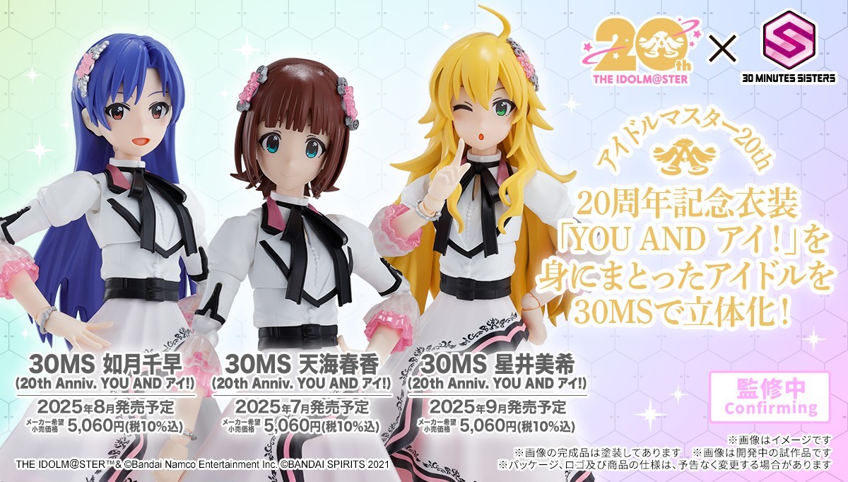 由日本 BANDAI SPIRITS 公司 HOBBY 事業部推出的原創機娘主題組裝模型『30 MINUTES SISTERS』系列繼《偶像大師 閃耀色彩》後,再度宣佈與迎來 20 周年的《偶像大師》本家合作,推出 765Pro 人氣偶像「天海春香」、「如月千早」、「星井美希」,商品預計於 2025 年 07~09 月發售。