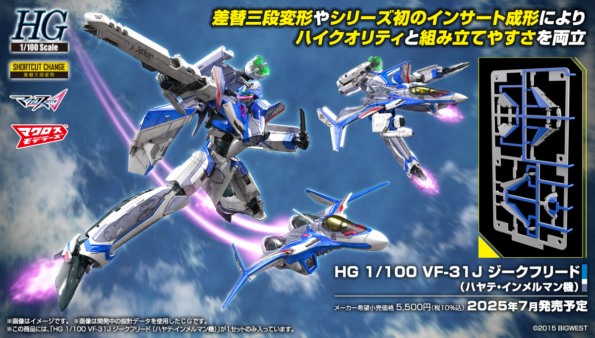 由日本 BANDAI SPIRITS 公司 HOBBY 事業部推出的《超時空要塞》系列『HG(High Grade)1/100 比例』組裝模型,今日發表了出自《超時空要塞Δ》的最新商品「VF-31J 英雄式(疾風・英麥曼座機)」預計於 2025 年 07 月發售的消息。