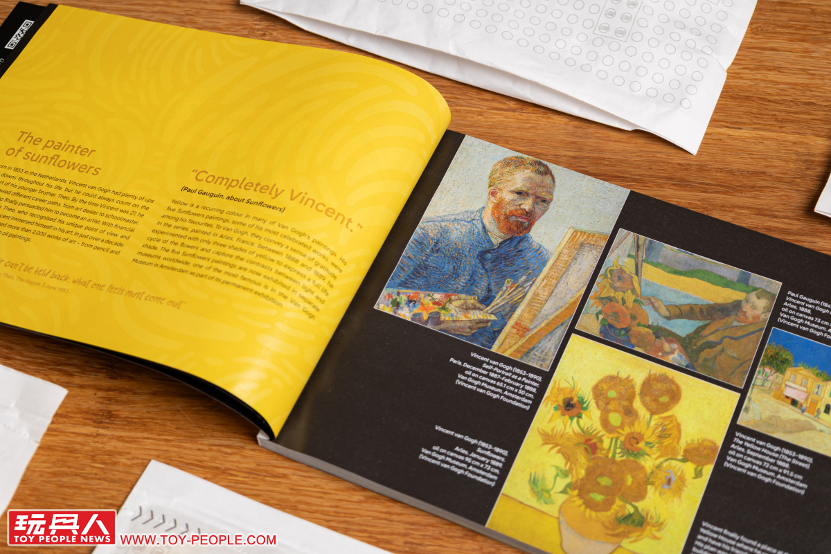 ▼ 說明書一本。內容包含梵谷的概略生平、創作〈向日葵〉系列畫作的時空背景,並透過法國畫家保羅·高更的觀點來說明梵谷在〈向日葵〉系列畫作中運用的技法。每一段文字都快速且精要地切入重點,讓玩具人們可以快速地認識梵谷與他的〈向日葵〉。