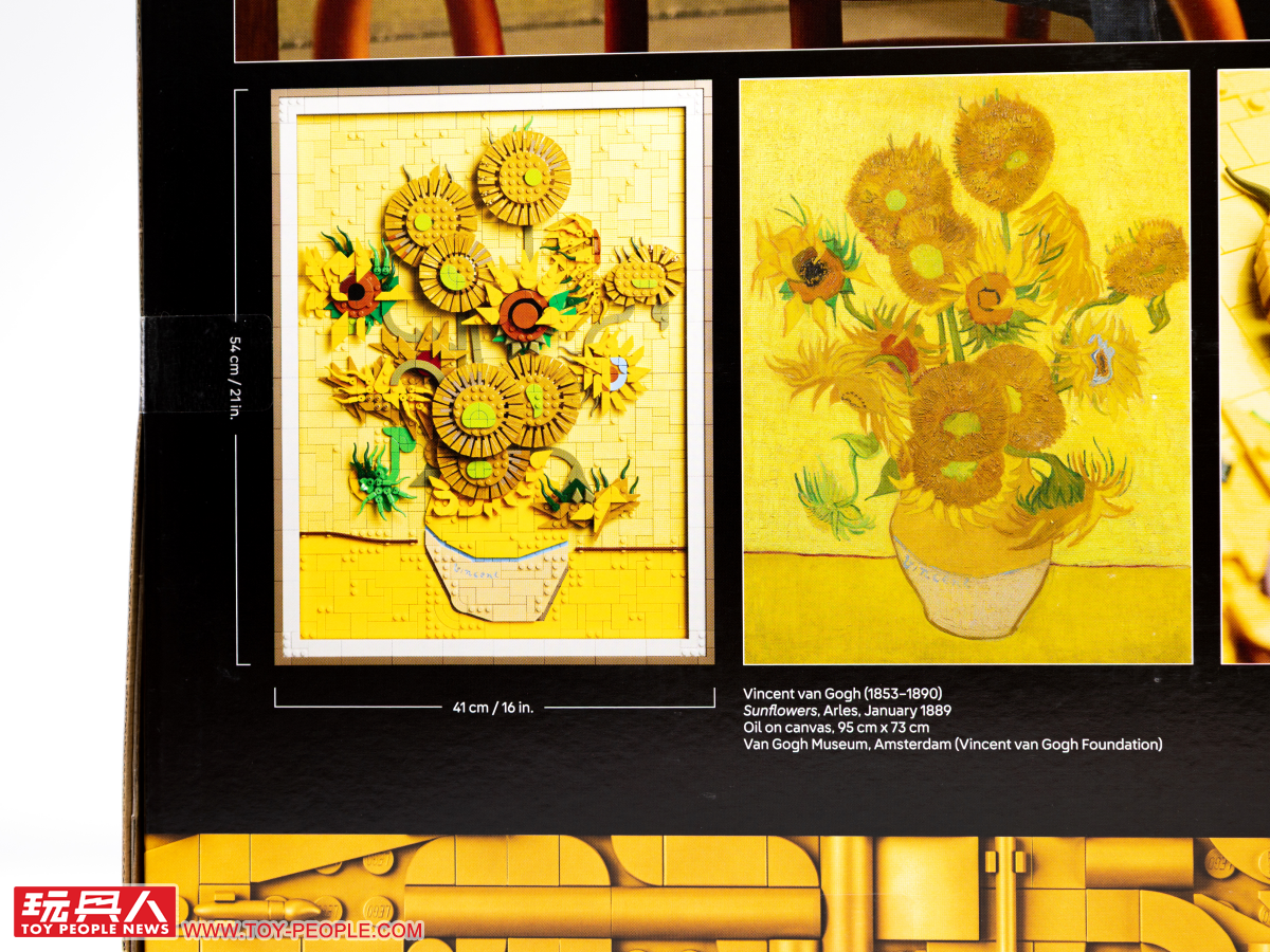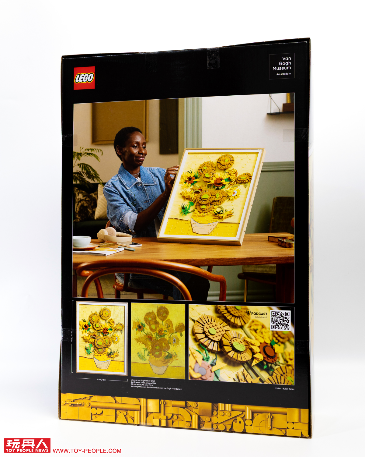 ▼ 轉到背面可以看到樂高拍攝的情境照,藉此感受到這款樂高畫作的強烈存在感。同時也有本作的規格、〈向日葵〉原畫的印刷、不同角度的特寫......等內容。