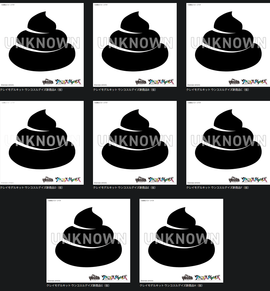 這款腦洞大開的新系列預計於 07~11 月間推出 8 款新商品,前七款均為售價 990 日圓(含稅)但目前尚未公開任何商品圖片,很有可能如商品 LOGO 所示分別為各種色彩的黏土,並結合不同的組裝模型套件製作便便。而預定 11 月發售的「商品H」則要價 3,300 日圓(含稅),無非就是要來坨大的,也能會附有豪華的配件?