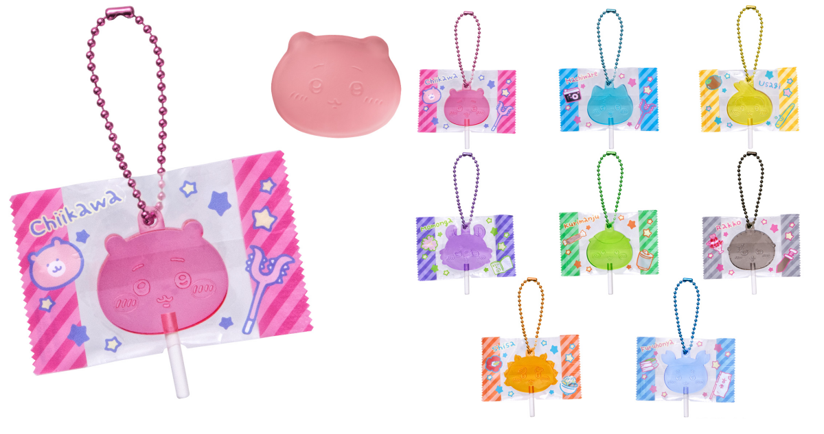 「吉伊卡哇 糖果造型吊飾」,將吉伊卡哇中的人氣角色化為棒棒糖造型,不僅有像是真正糖果般的透明感繽紛色彩,還有可愛且逼真的包裝袋,不仔細看真的會以為是把棒棒糖掛在身上呢!收錄有:吉伊卡哇、小八、兔兔、小桃、古本、栗子饅頭、海獺勇者、風獅獅薩,每種款式搭配角色,配有不同顏色的彩色球鏈,可以吊掛展示或是掛在包包上隨身攜帶~另外,每包附一顆桃子口味的角色造型軟糖!超可愛的大頭,怎麼捨得吃~~