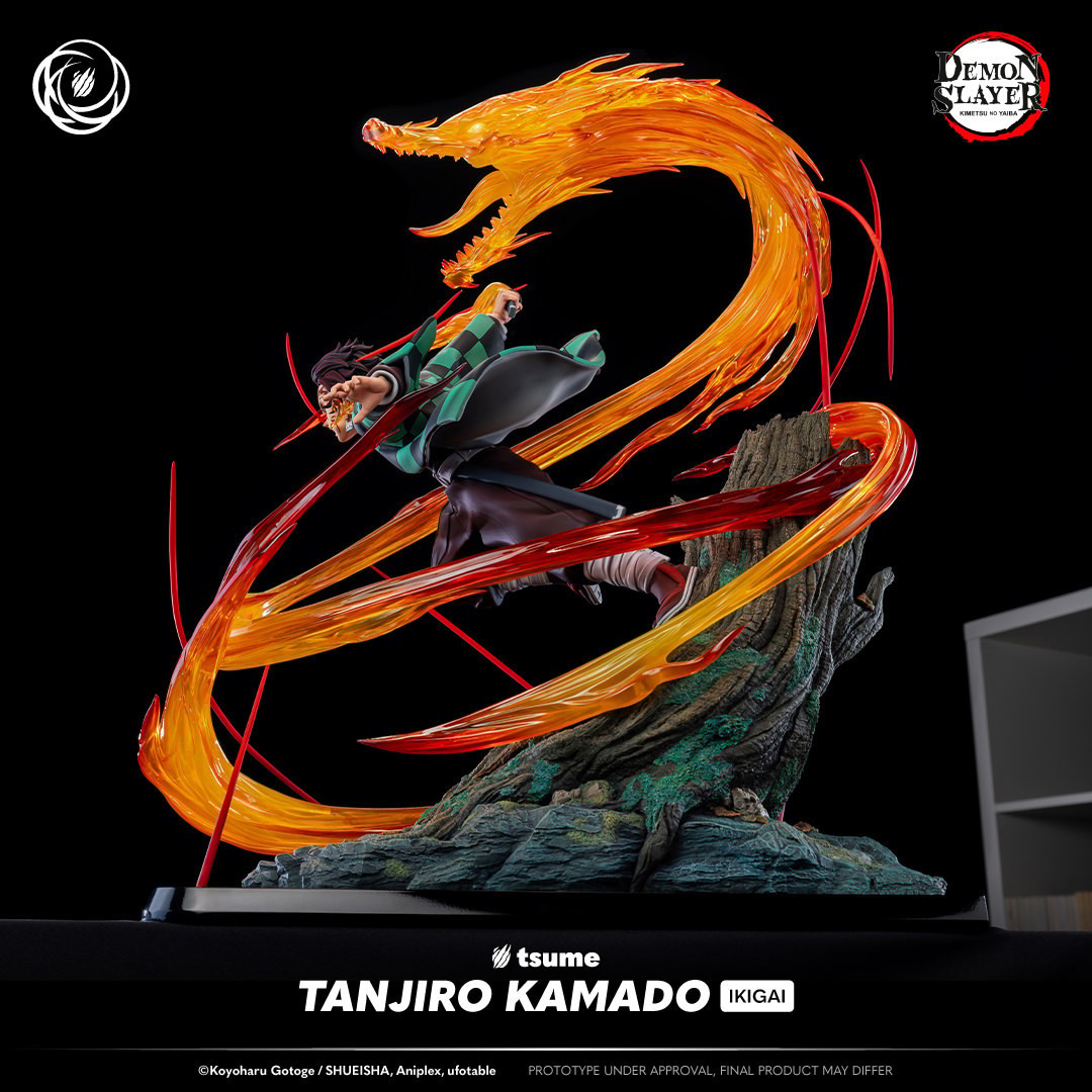 本次的竈門炭治郎1/6比例收藏雕像高約參考的是重播次數最多的動畫第一季第19集〈火之神〉中,炭治郎對戰累時首次使出「火之神神樂」時的姿態,並結合「日之呼吸 第拾壹型 龍舞」的特效,製作出他腳踩在樹幹上躍動攻擊的模樣,雕刻還原鬼殺隊服與綠黑方格羽織的皺摺及造型細節,他堅毅的眼神、飄逸的頭髮及耳環也被細緻再現!